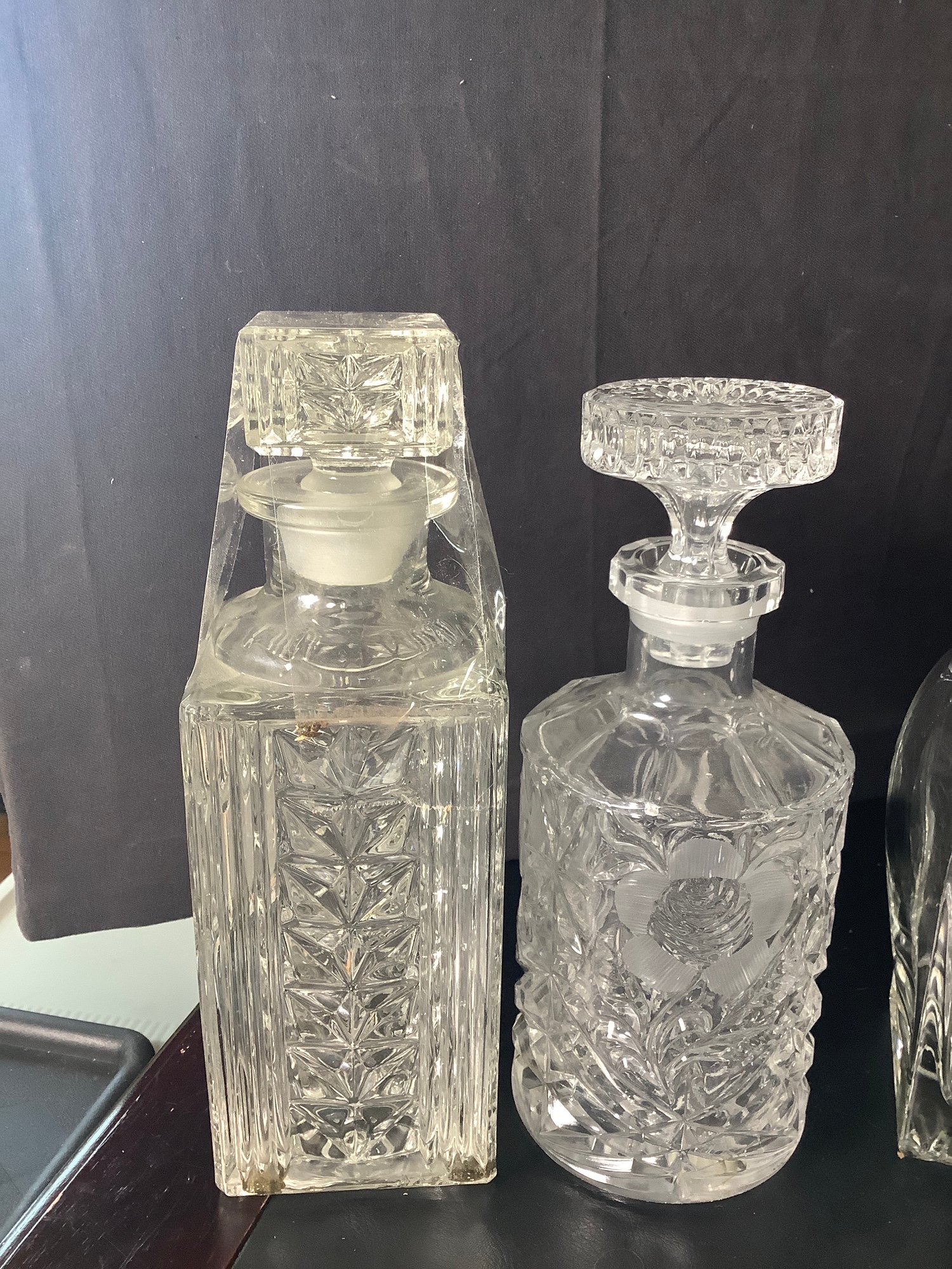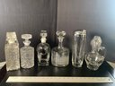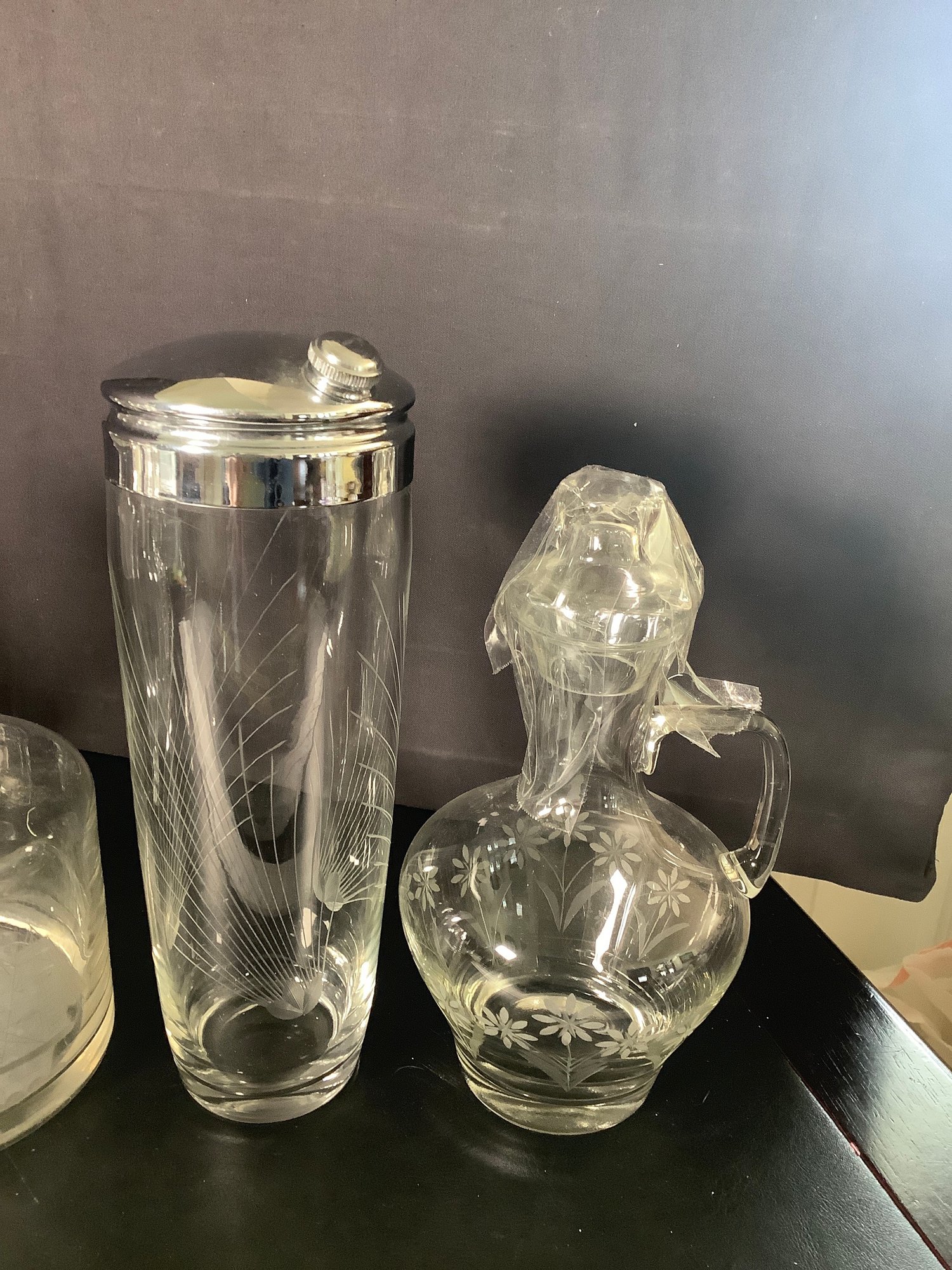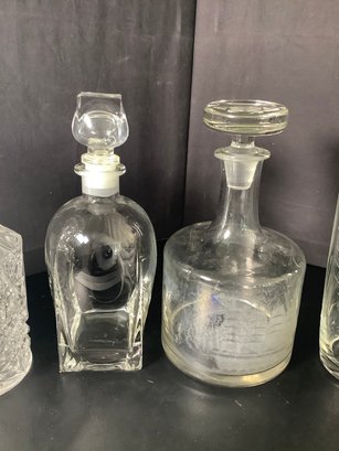 Vintage barware decanters and drink shaker. Includes 5 decanters and one etched drink shaker. Preowned. Photos are part of the description. NO SHIPPING!!!