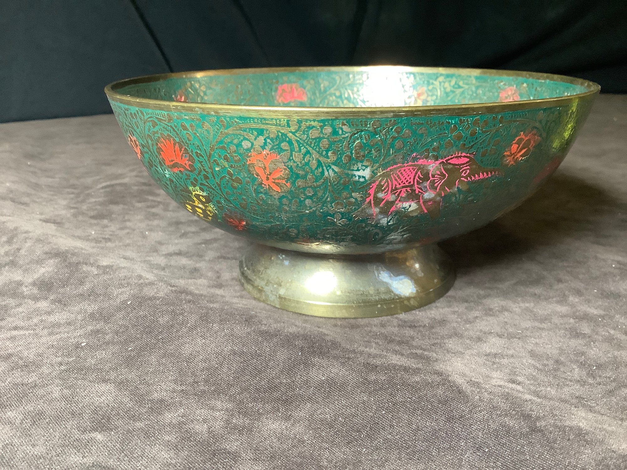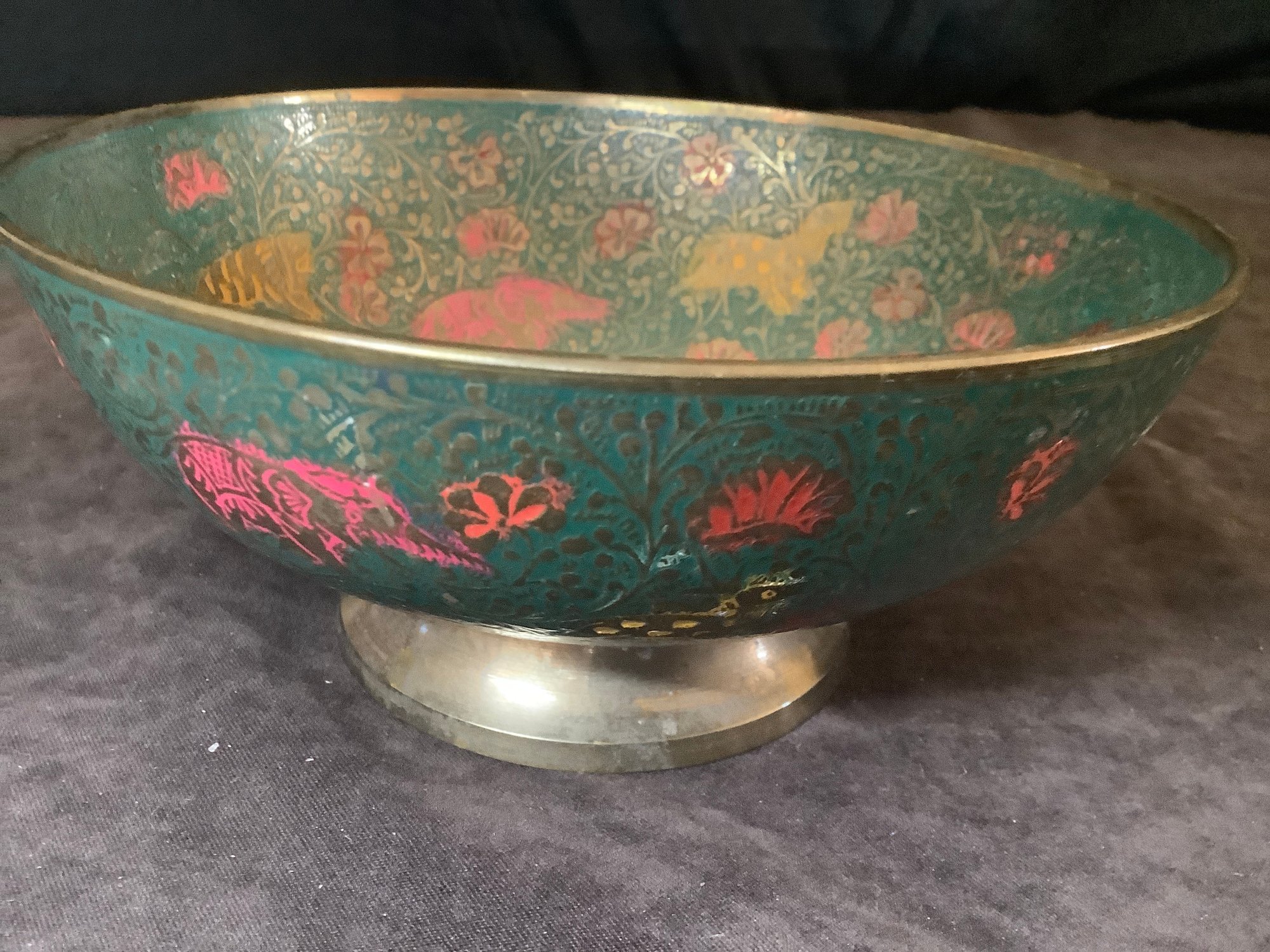 It sits on a brass pedestal base. The bowl measures approx. 6 1/4” across.