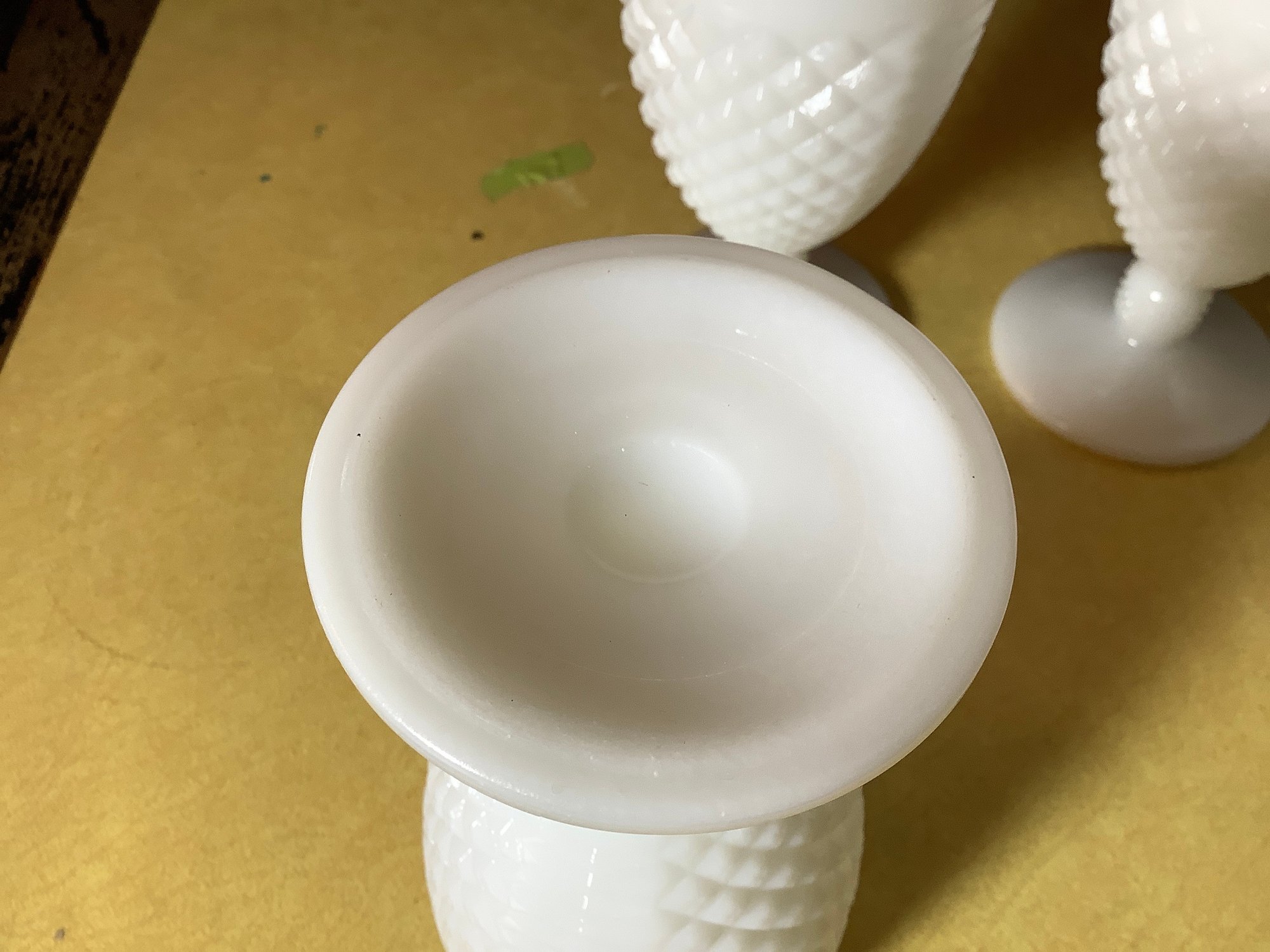 Anchor Hocking Milk Glass diamond cut and ladder design. Water Goblets. 5 pieces 3” round x 5-1/2” tall . Photos are part of the description. Preowned. NO SHIPPING.