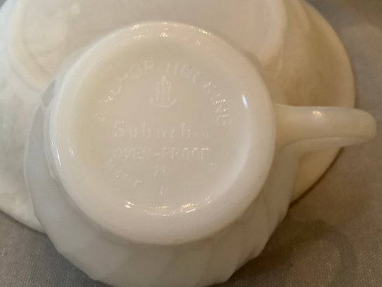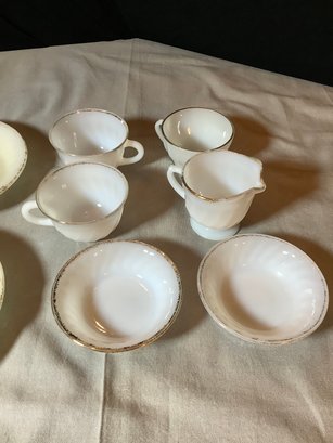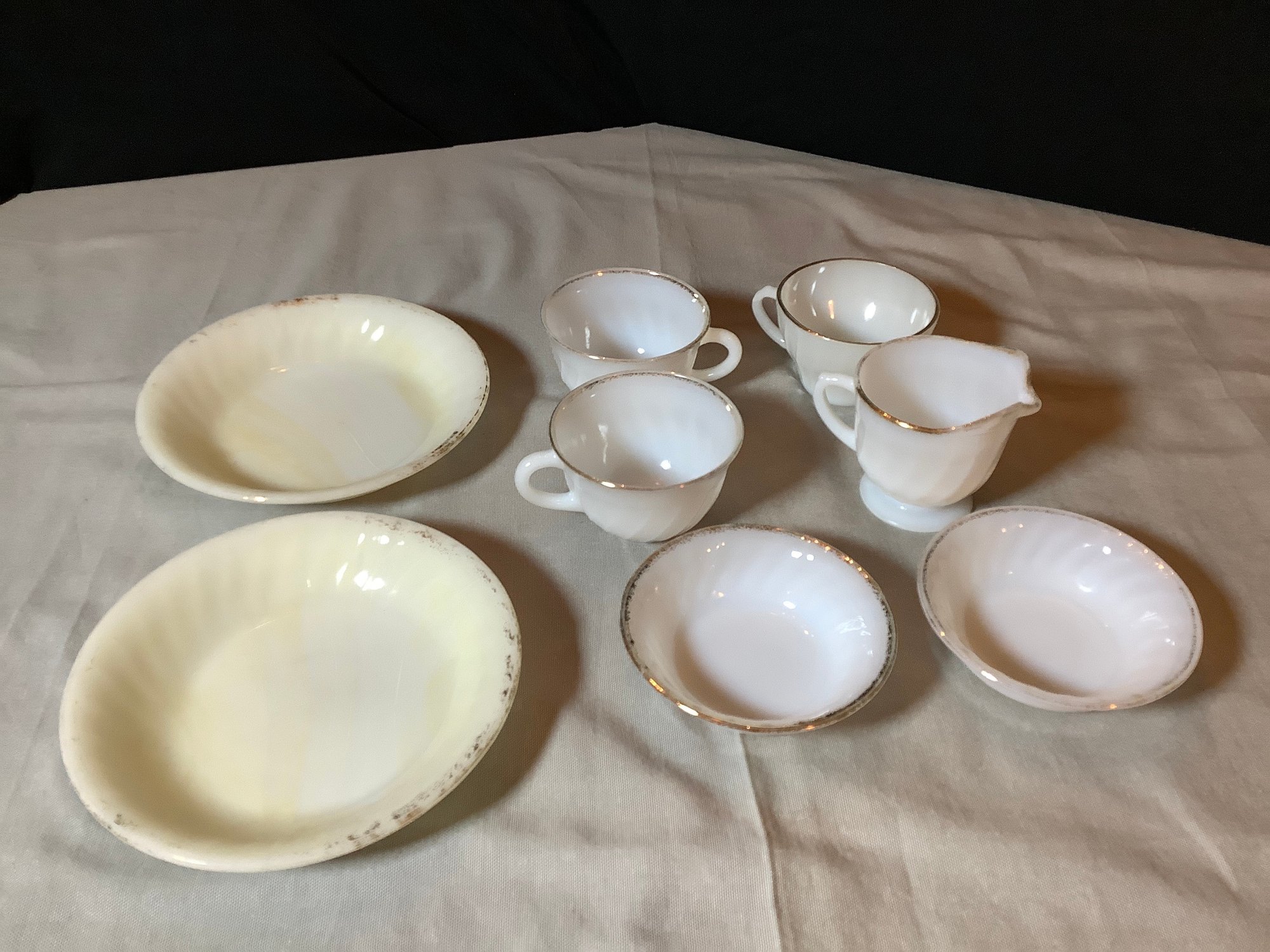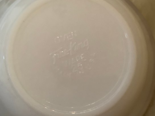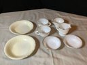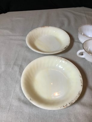 Vintage Fire-King and Anchor Hocking dishes. All marked for use in oven. Includes creamer, 2, 5” dishes, 3 cups and 2, 7-1/2” dishes. Has paint loss. Photos are part of description. NO SHIPPING