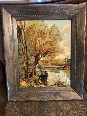 Vintage framed needle point. Scene edge of a river. . Size 21” X 25”. Photos are part of the description. Pre-owned. No shipping.