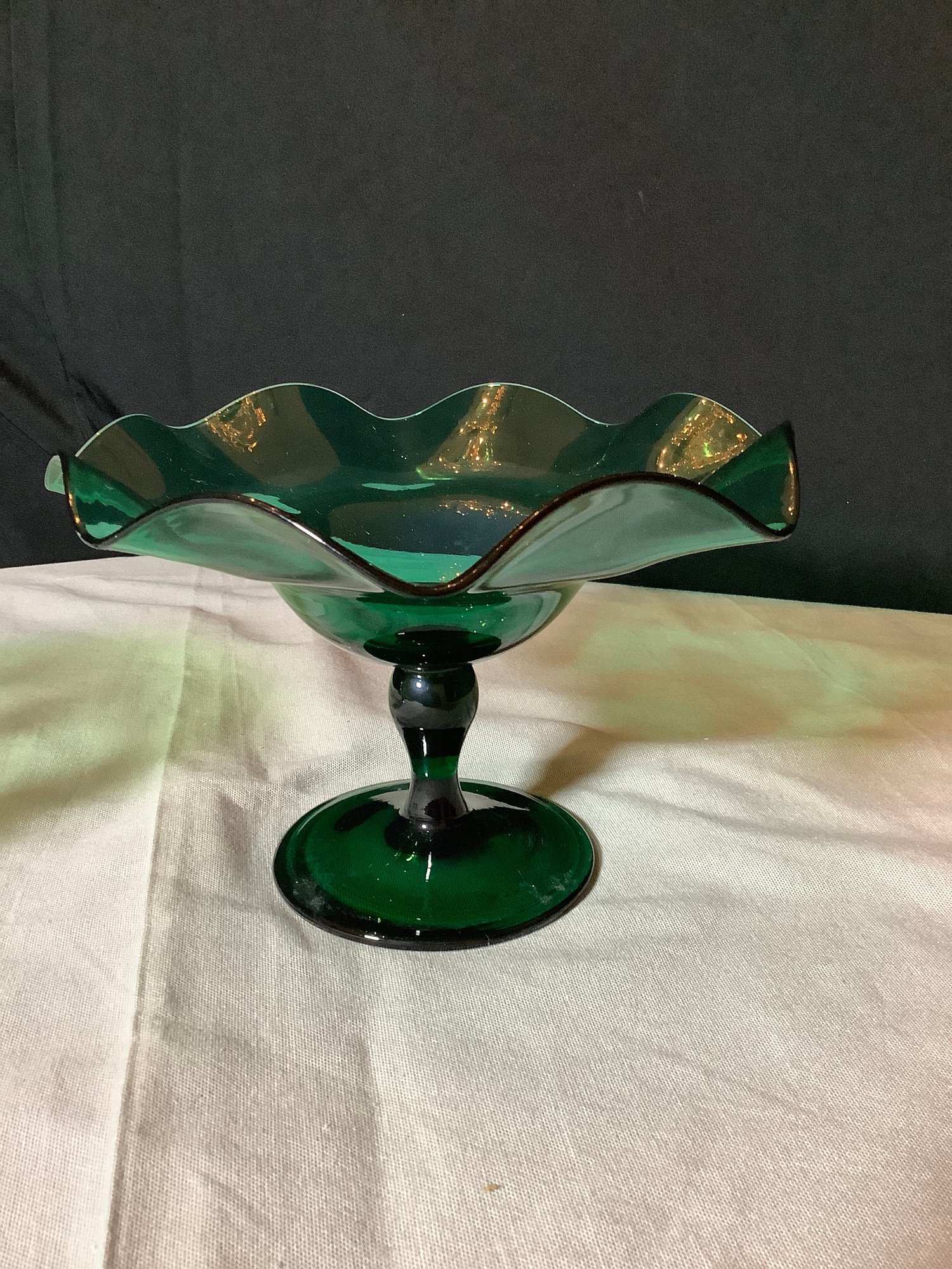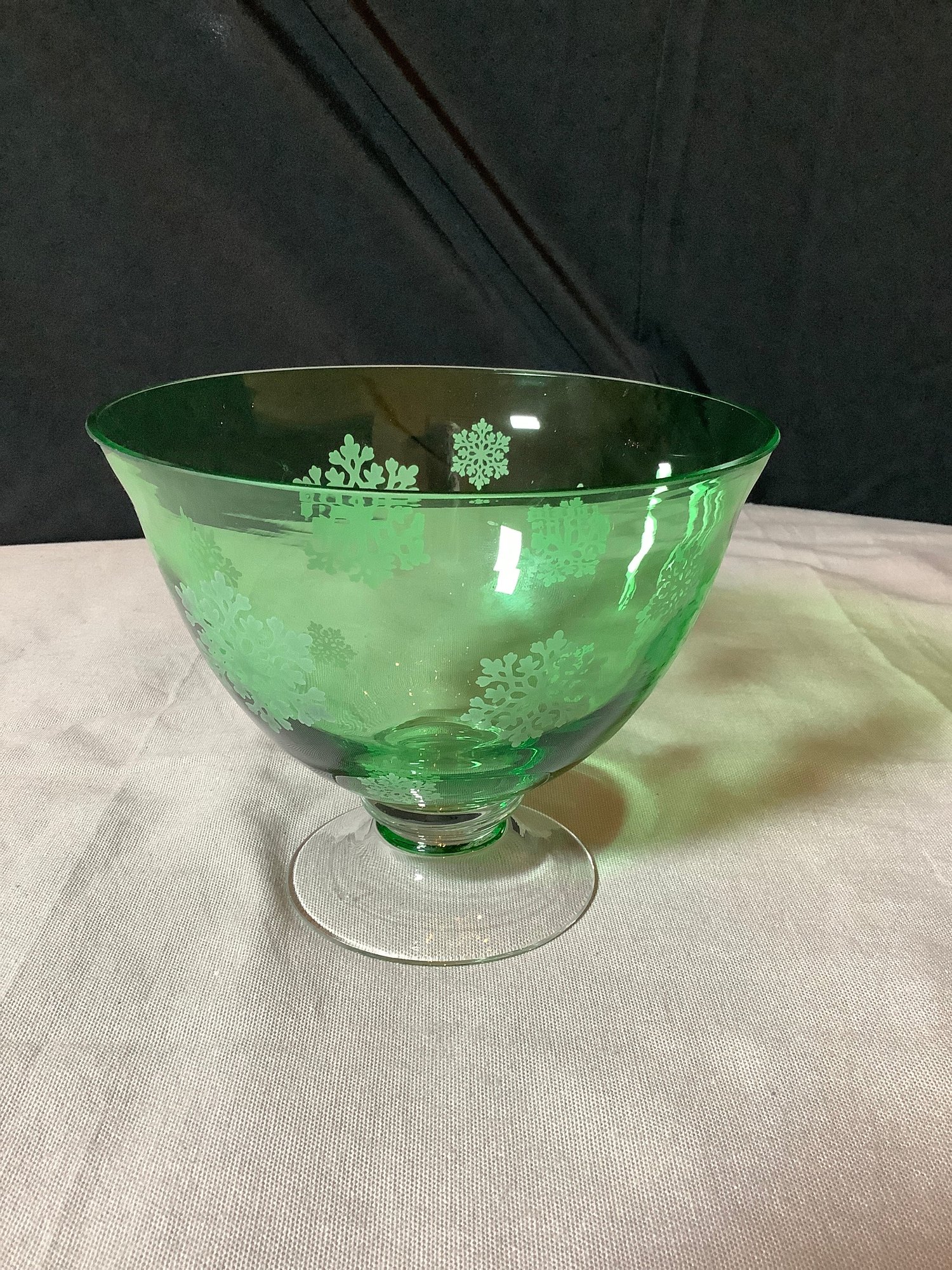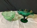 Vintage glass. Green bowl has snow flakes and clear foot, size is 7” x 7” x 5-1/2” tall. Green ruffled compote is 9” x 9” x 6-1/4” tall. No chips or cracks found. Photos are part of the description. Preowned . NO SHIPPING!