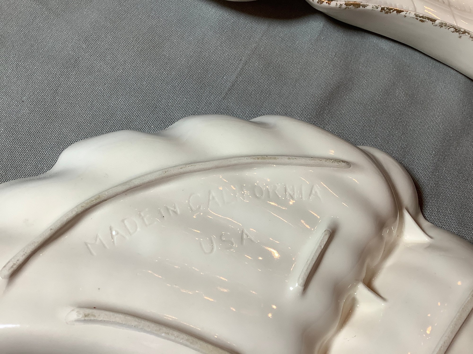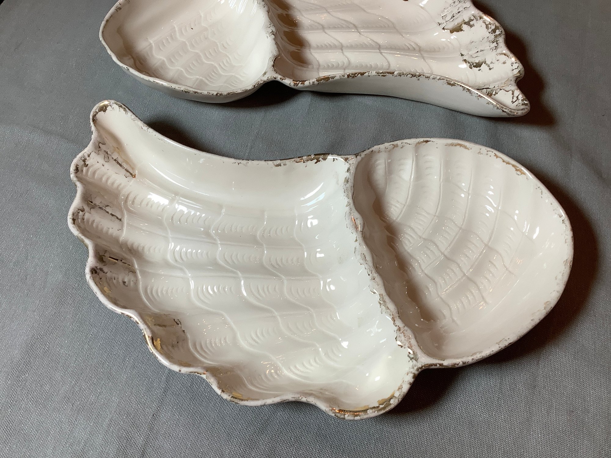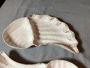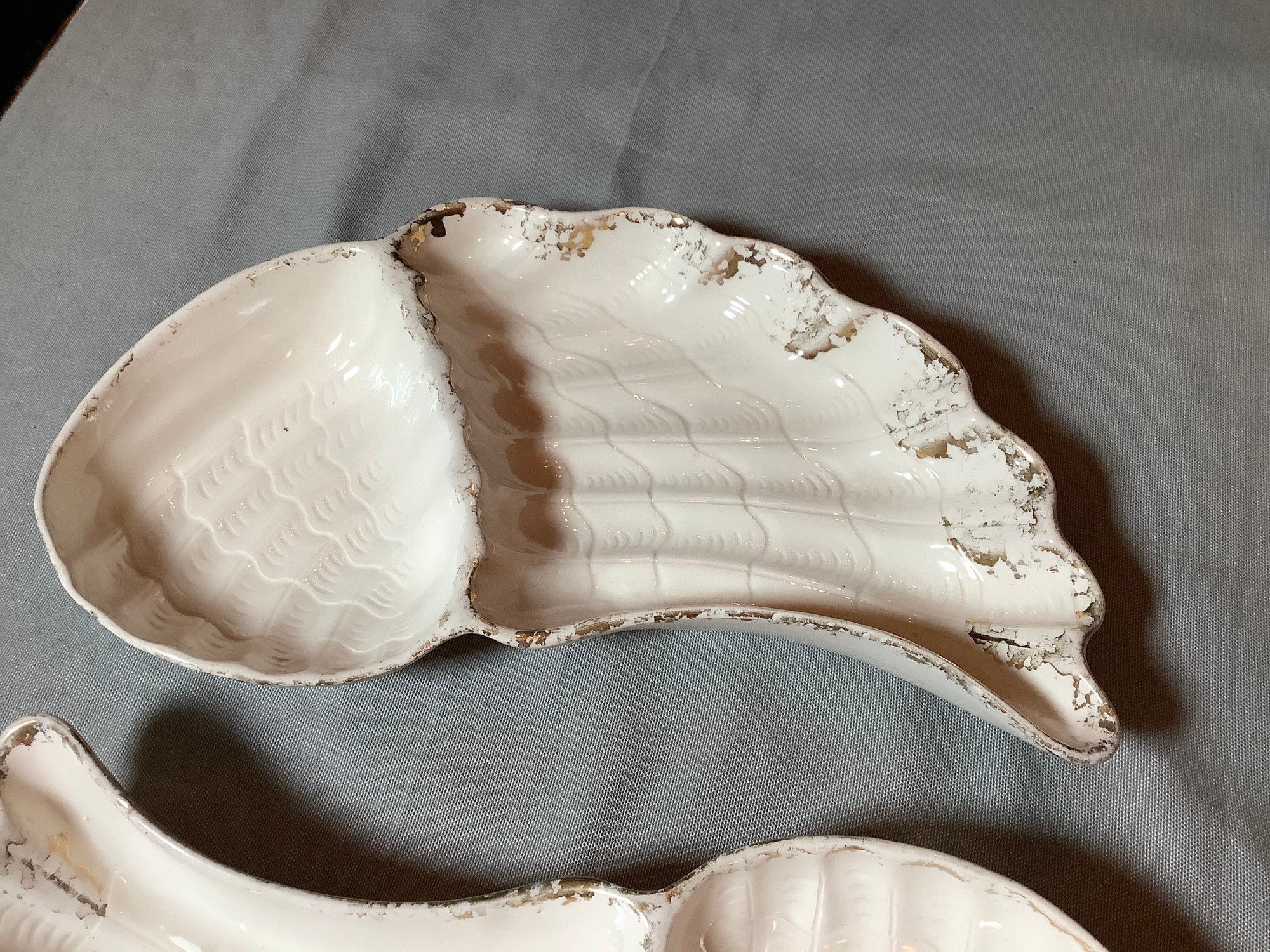 2 Vintage made in California Angel wing chip dishes. Size 14” x 7”. Has paint loss. Photos are part of description. NO SHIPPING