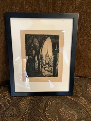 Vintage Pen and Ink drawing.. Scene looking through church doors. Size 12” X 15”. Photos are part of the description. Pre-owned. No shipping.