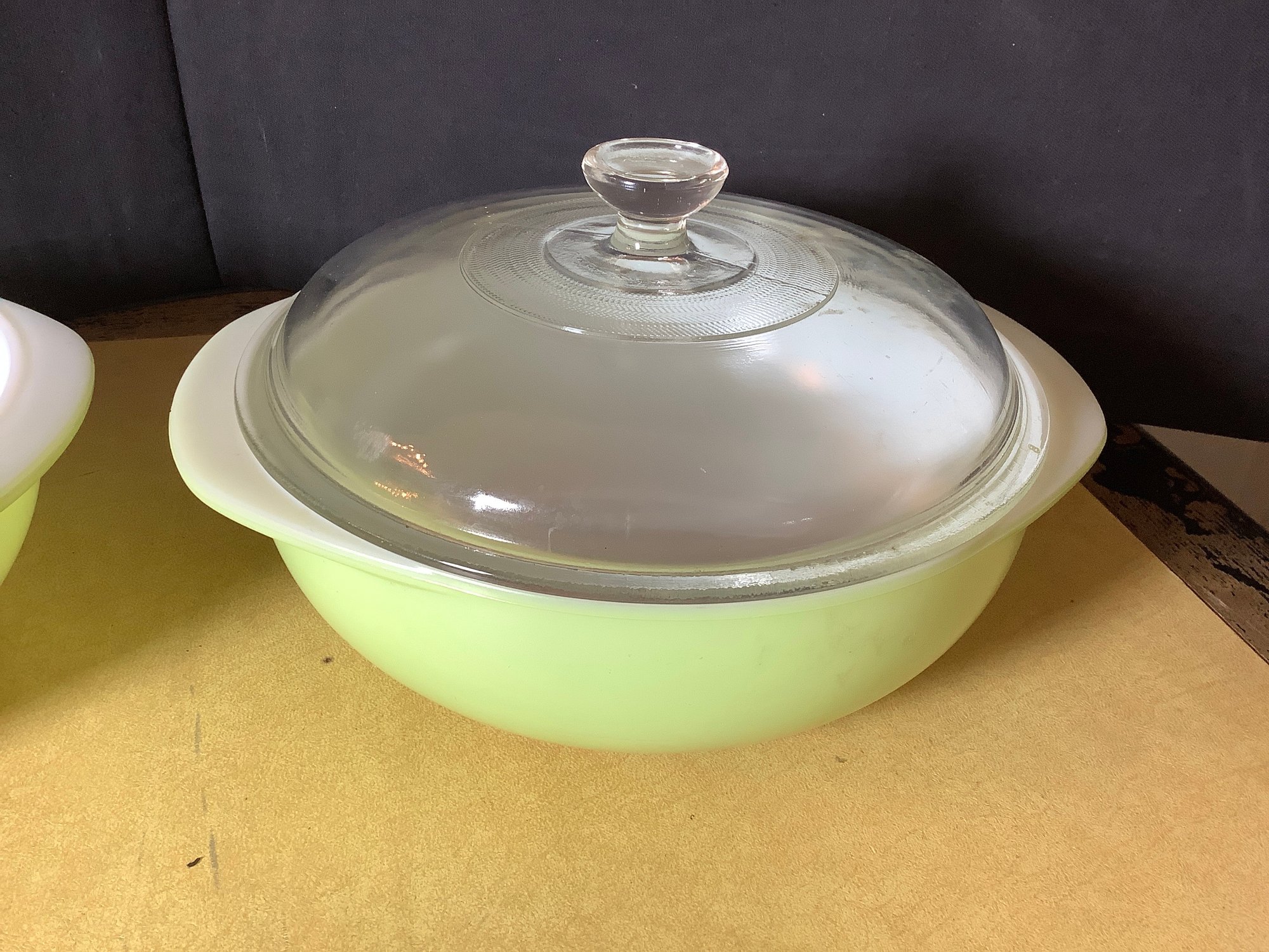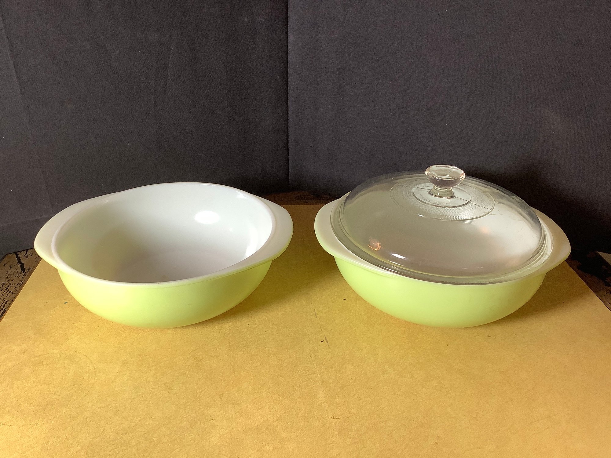 Vintage MCM set of 2 Pyrex Lime green round dishes. Size 2 quart dishes and 1 lid. Photos are part of the description. Preowned. NO SHIPPING.