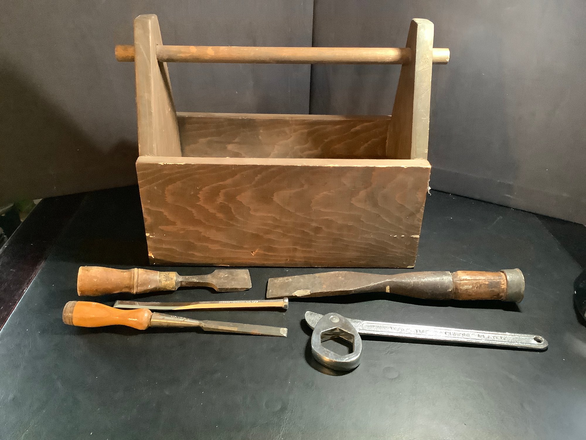 Vintage wood box with tools. Box 13” x 7” x 11”. Includes wood box Chisels , pliers, screw drivers and more. Preowned. Photos are part of the description.