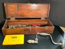 Vintage wood box with tools. Box 21” x 7” x 5”. Includes wood box Brace/drill, pliers, shears and more. Preowned. Photos are part of the description.