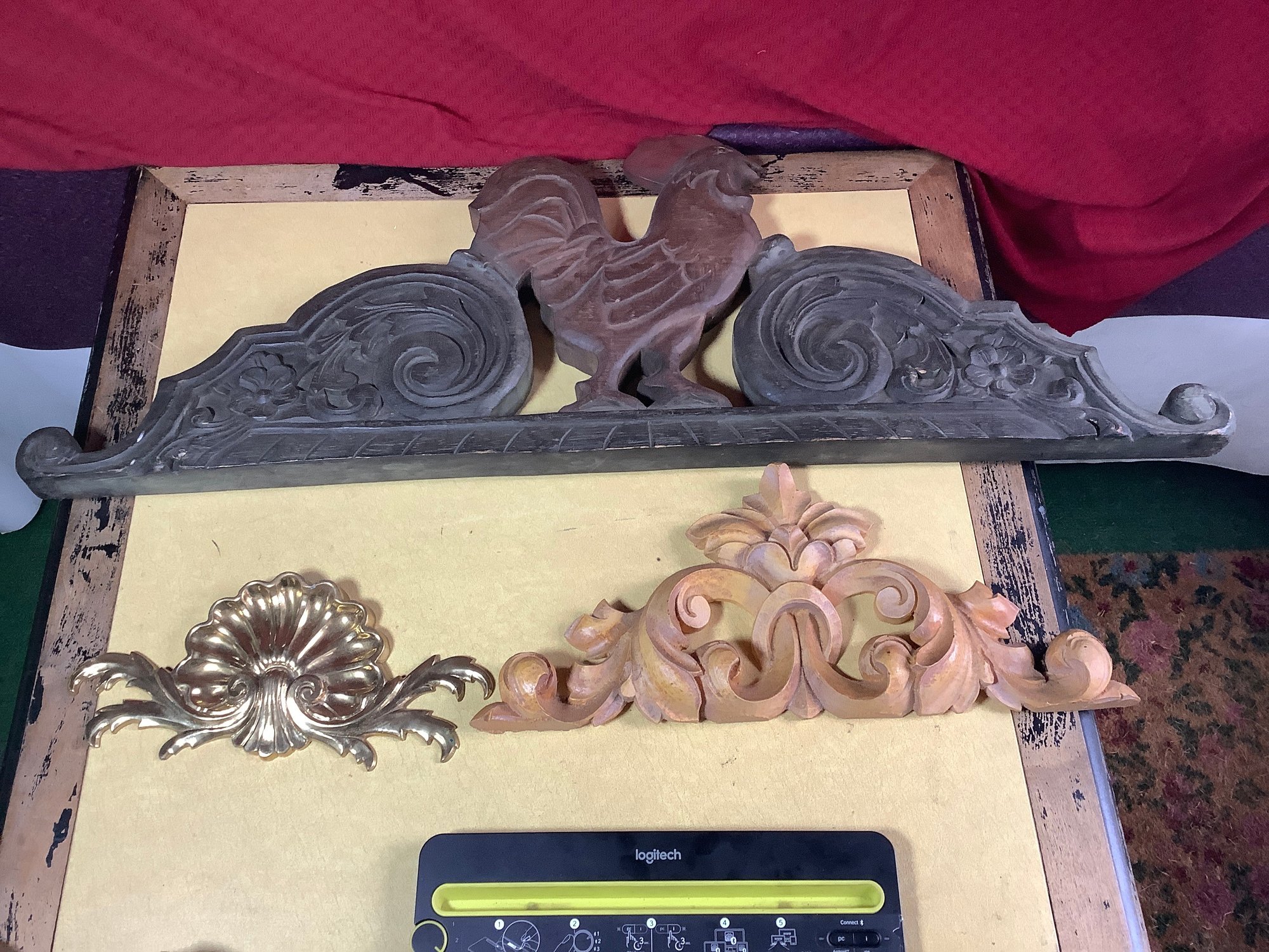 Wall deco. Includes large carved chicken 35” x 13-1/2”, brass shell and decorative carving. Pre-owned. Photos are part of the description. NO SHIPPING