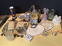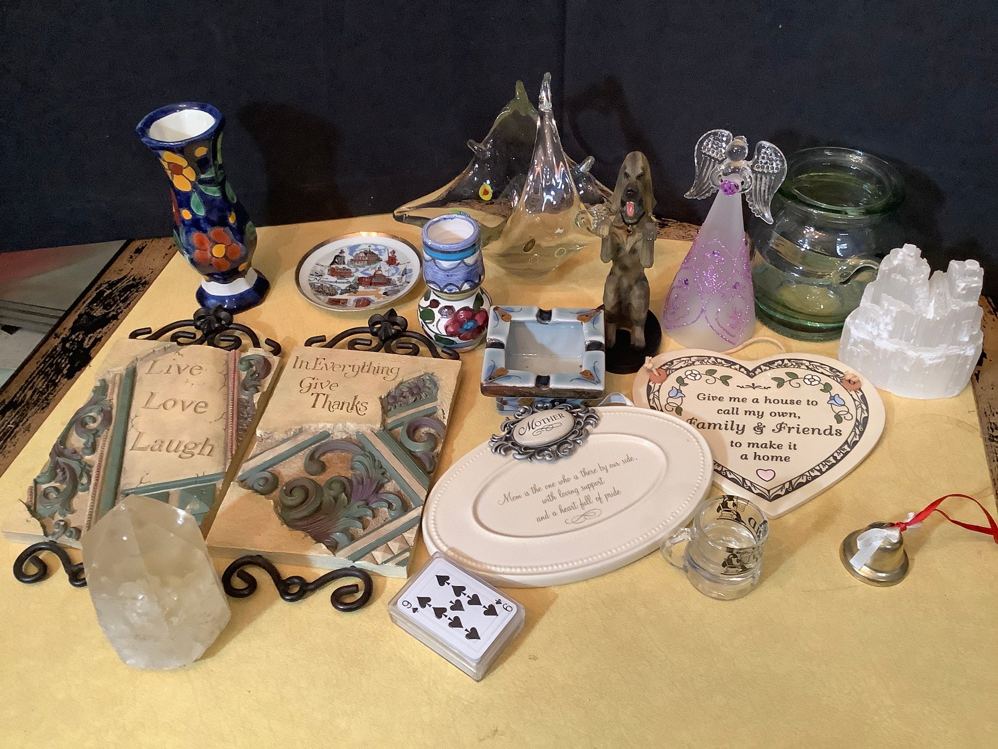 Items include glass basket, figurines,