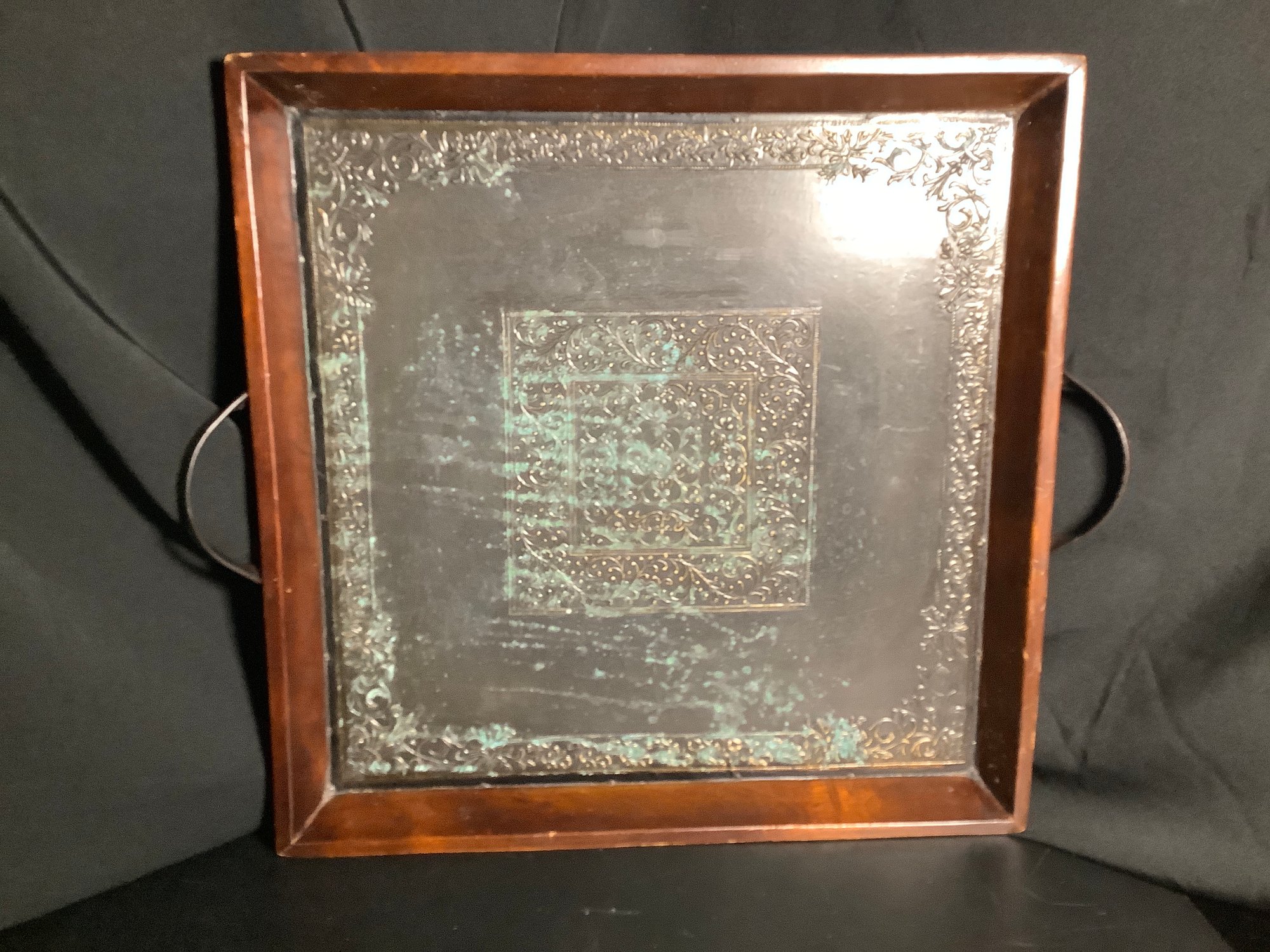Wood sides and metal bottom serving tray.