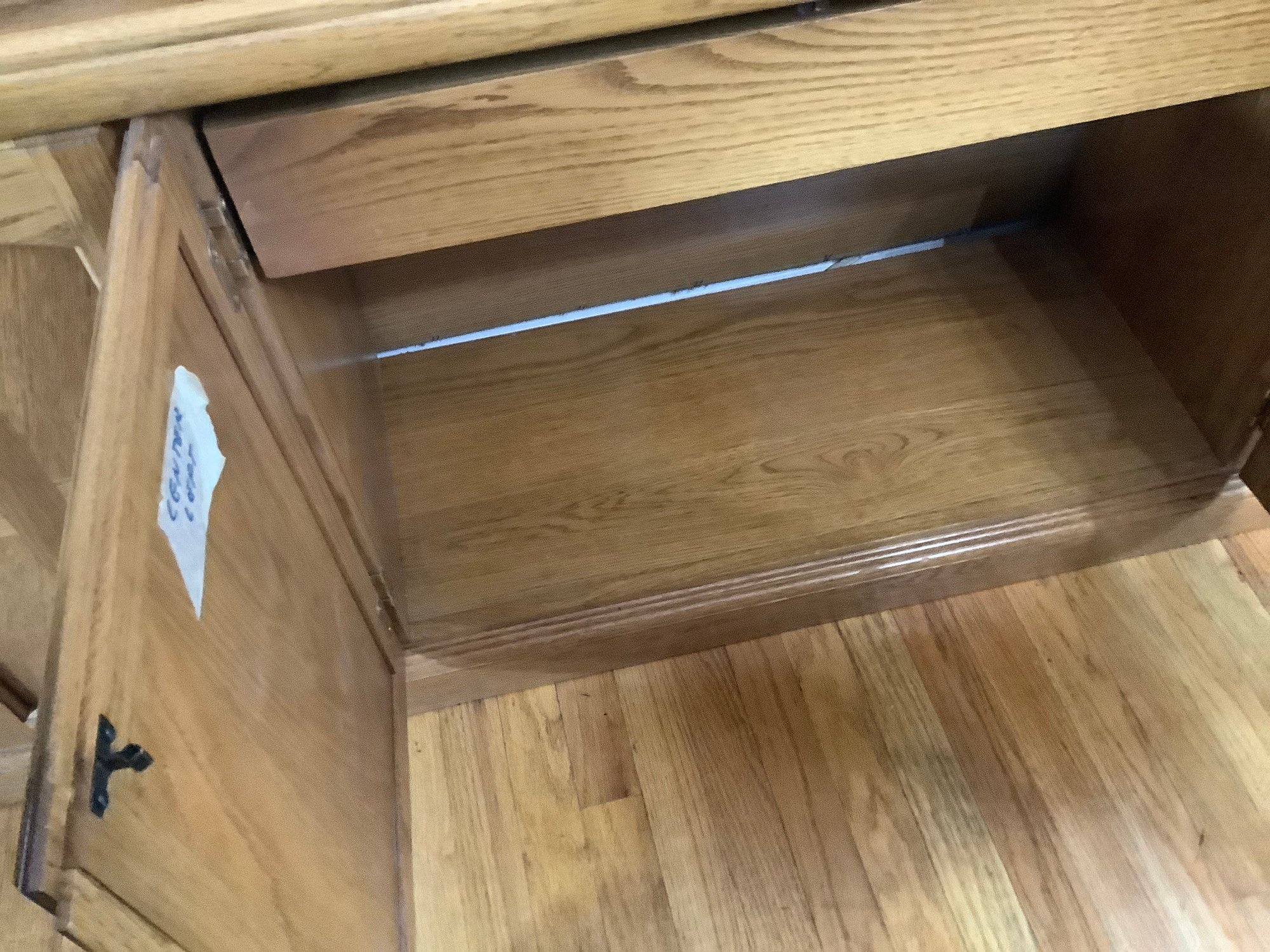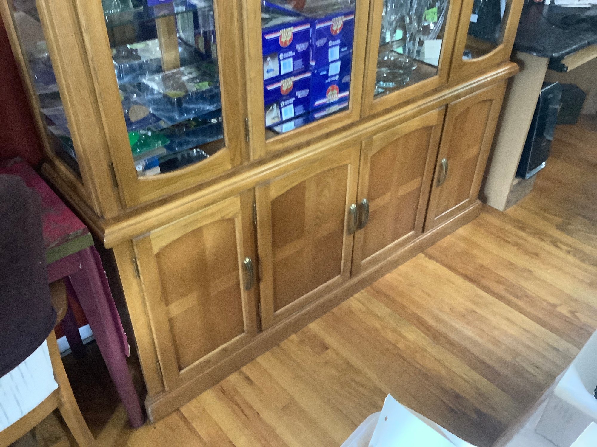 Wood China Cabinet. Contents not included. Size 66” x 16” x 78” tall. Upper section comes off 66” x 50” x 15”. 2 glass shelves. Photos are part of the description. Pre-owned. Located on second floor. Bring help to move.