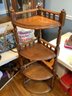 Wood corner shelf unit. Size 14-1/2” x 14-1/2” x 52” tall. Unit has 4 shelves. Need polish. Photos are part of the description. Preowned. No shipping