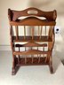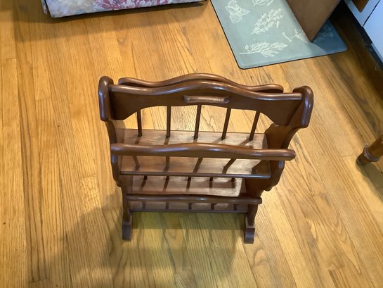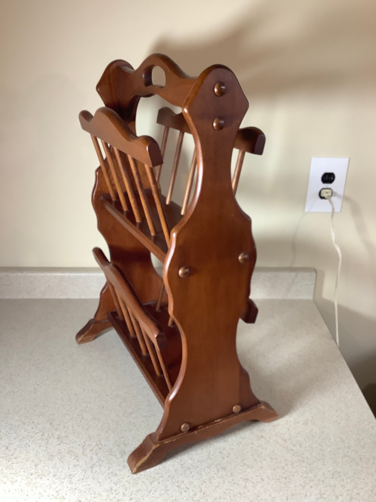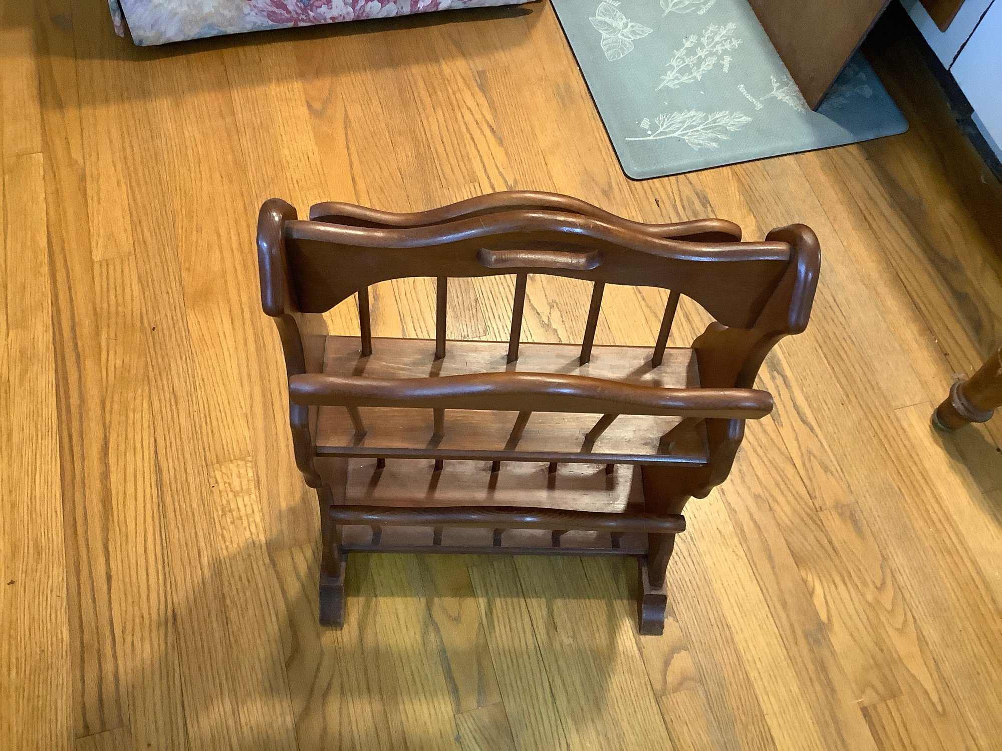 Wood magazine rack. Size 16” x 7-1/2” x 23” tall. Photos of part of the description. Preowned..No SHIPPING.