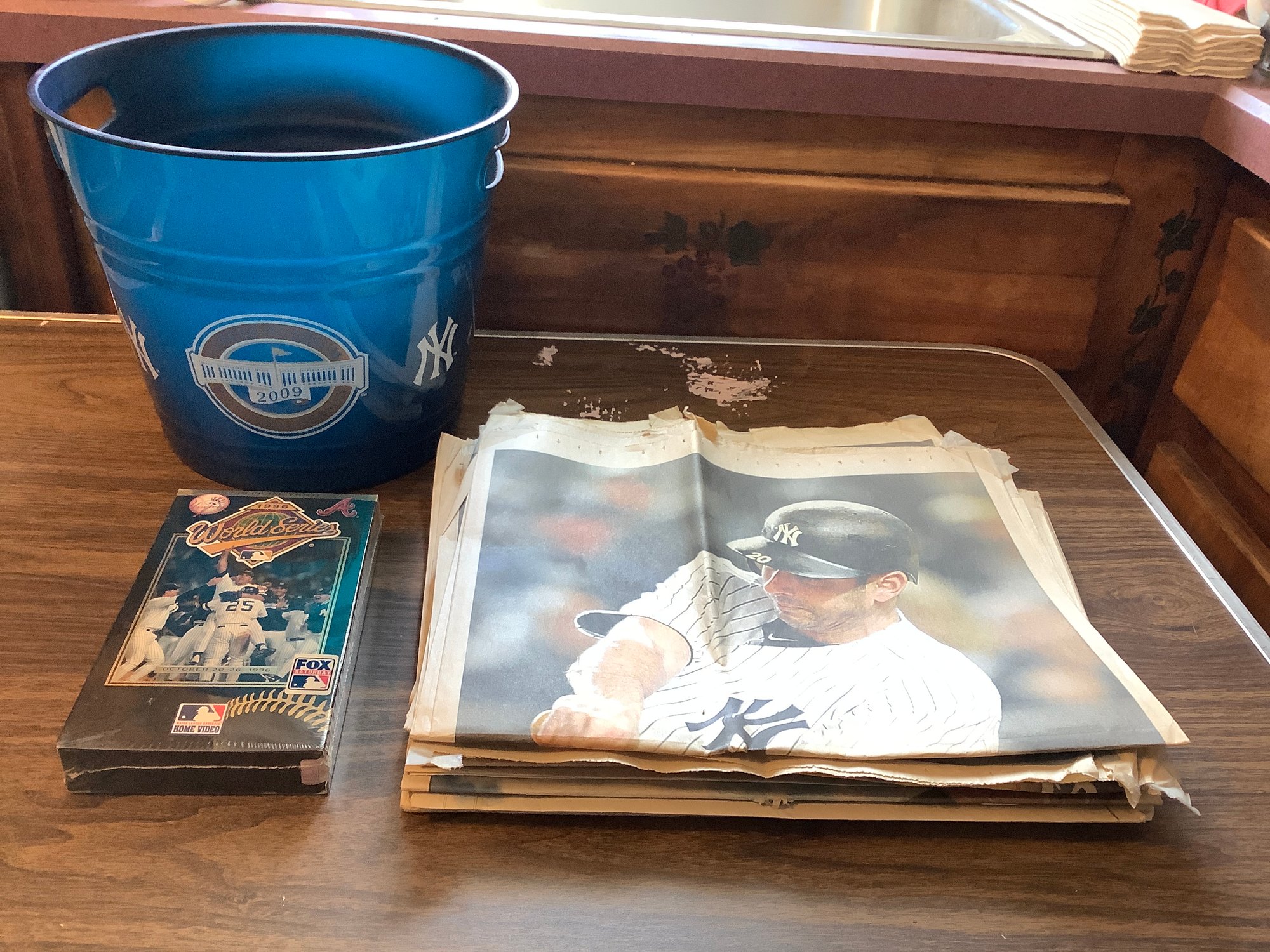 NY Yankee’s collectibles. Includes 2009 ice bucket, 1996 World Series VHS and Daily News Yankee photos. Preowned. Photos are part of the description.