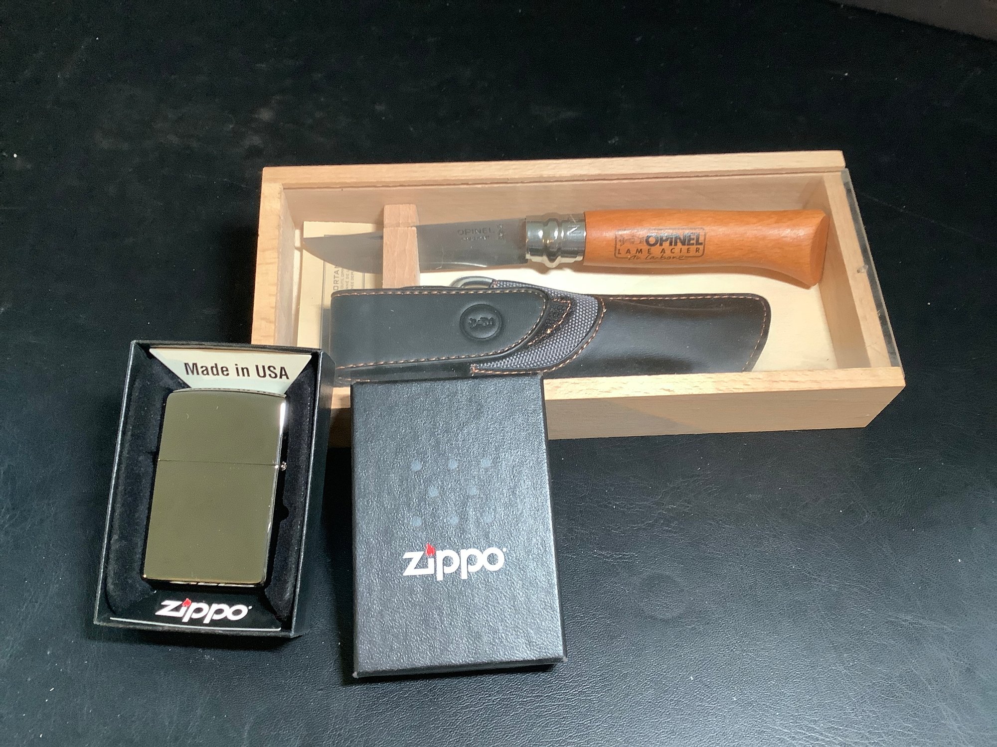 New Zippo lighter and new Opinel knife with case. Both in new condition. Photos are part of the description.