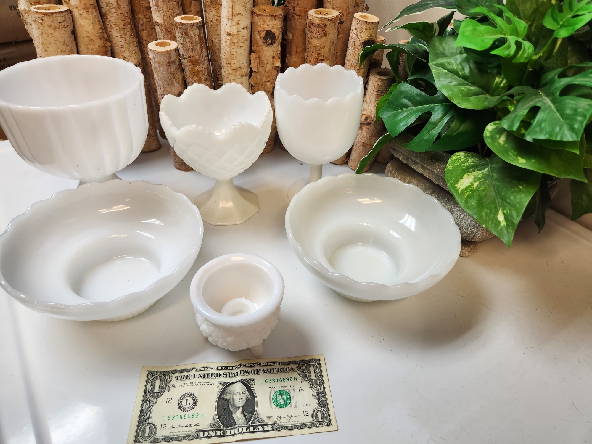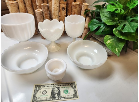 Check out this assortment of Smith Glass and E.O Brody milk glass dishes, including the cauldron style candle holder and two large bowls. Variety of patterns and sizes. No visible blemishes; glass is bright with no visible fading.