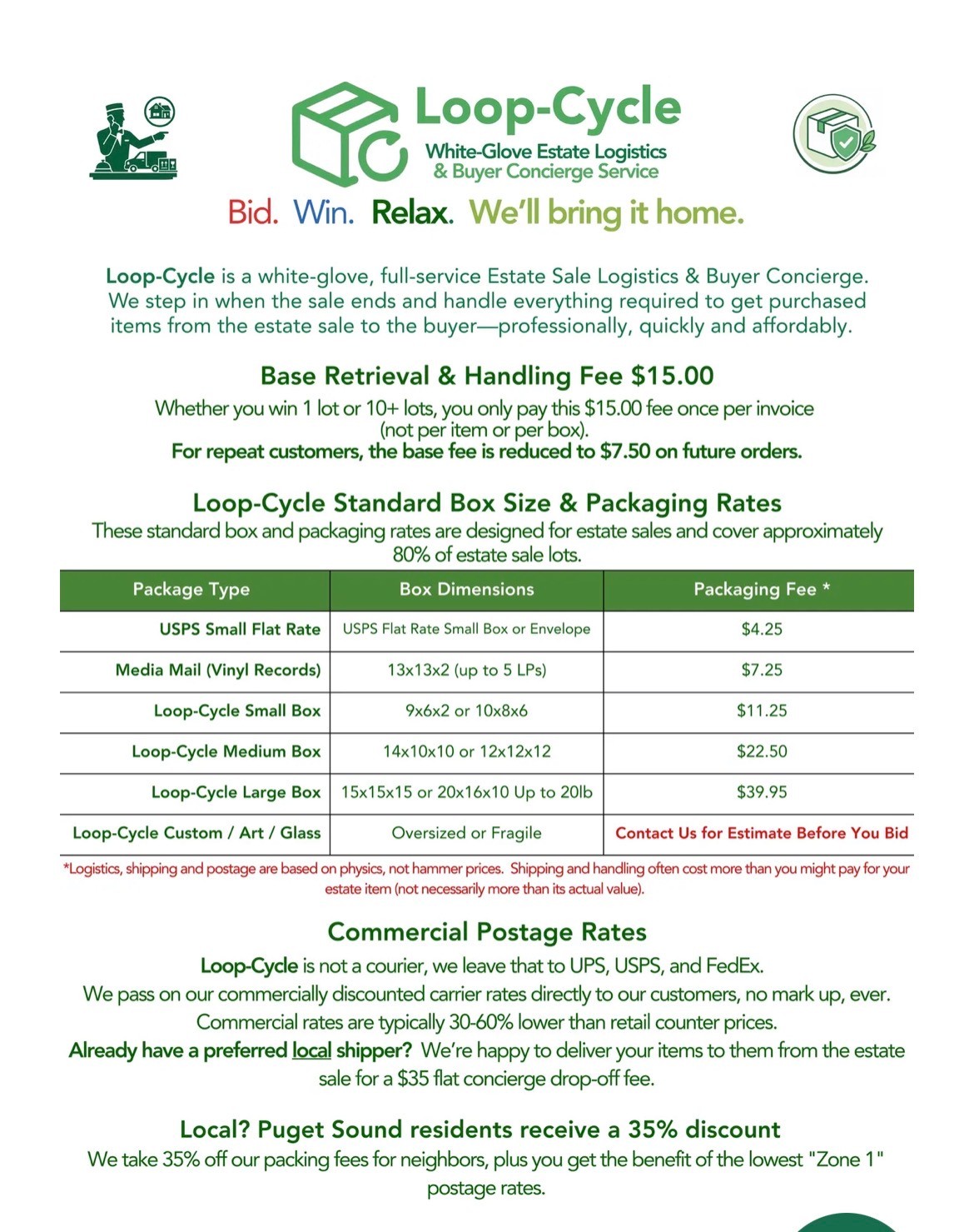 Please note the following important information regarding shipping and identification requirements for all winning bidders. **Identification and Shipping Address:** * All winning bidders are required to provide identification. The shipping address must match the address on your credit card and ID. If these do not match, we will be unable to release your items for shipping. Please ensure your shipping information is updated before placing any bids. No In-house shipping effective February 20th, 2026. We have outsourced to Loop-cycle.com LoopCycle handles all of our auction shipping! Here’s what you need to know: 1. Flat Rate Box Pricing Posted Online *Flat-Rate Simplicity: Each box ships at a flat handling fee of $15 for first-time customers and is now $7.50 for repeat buyers. *USPS Small Flat Rate boxes will ship at Base Fee + discounted USPS postage (typically around $9.60). *If you win multiple lots, we’ll combine them whenever possible to save you money. *Bulky or Fragile Items: For larger or fragile pieces, just contact LoopCycle directly for a quick quote before you bid. Stress-Free Shipping: Once you’ve won, LoopCycle handles pickup, packing, and delivery coordination. It’s like having a personal concierge for your auction treasures! 2. Standard Box Pricing Posted Online. The website now lists a simplified set of standard Small, Medium, and Large box sizes with pricing, so buyers can easily estimate shipping costs before bidding — without needing to request a quote. 3. New Online Quick Estimate Request Form. We’ve added a simple form that allows buyers to request an estimate directly from the website while browsing, particularly for lots that fall outside standard box sizes or require extra-fragile packing. For rates, box sizes and service details visit www.Loop-cycle.com. We cannot release your order until we have received both the signed invoice and, if applicable, a copy of your ID.* **Bid Retractions:** Bids cannot be retracted, canceled, or rescinded due to shipping issues, including costs or prohibitions. Bidders are responsible for considering all shipping costs before placing a bid.* **Liability:** HE&A is not responsible for loss or damage of purchased items handled or shipped, nor for actions or omissions by third-party shippers (whether recommended by HE&A or not).* **International Regulations:** Buyers must be aware of local regulations regarding the shipping or receipt of items such as ivory, taxidermy, and firearms. HE&A will not alter packing slips, lot descriptions, or prices paid. If items are seized by customs, HE&A is not liable for costs or refunds. If you are unsure about local rules and regulations, please do not bid on items that may violate those regulations.