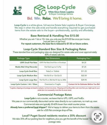1. Flat Rate Box Pricing Posted Online *Flat-Rate Simplicity: Each box ships at a flat handling fee of $15 for first-time customers and is now $7.50 for repeat buyers. *USPS Small Flat Rate boxes will ship at Base Fee + discounted USPS postage (typically around $9.60). *If you win multiple lots, we’ll combine them whenever possible to save you money. *Bulky or Fragile Items: For larger or fragile pieces, just contact LoopCycle directly for a quick quote before you bid. Stress-Free Shipping: Once you’ve won, LoopCycle handles pickup, packing, and delivery coordination. It’s like having a personal concierge for your auction treasures!