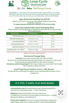1. Flat Rate Box Pricing Posted Online *Flat-Rate Simplicity: Each box ships at a flat handling fee of $15 for first-time customers and is now $7.50 for repeat buyers. *USPS Small Flat Rate boxes will ship at Base Fee + discounted USPS postage (typically around $9.60). *If you win multiple lots, we’ll combine them whenever possible to save you money. *Bulky or Fragile Items: For larger or fragile pieces, just contact LoopCycle directly for a quick quote before you bid. Stress-Free Shipping: Once you’ve won, LoopCycle handles pickup, packing, and delivery coordination. It’s like having a personal concierge for your auction treasures!