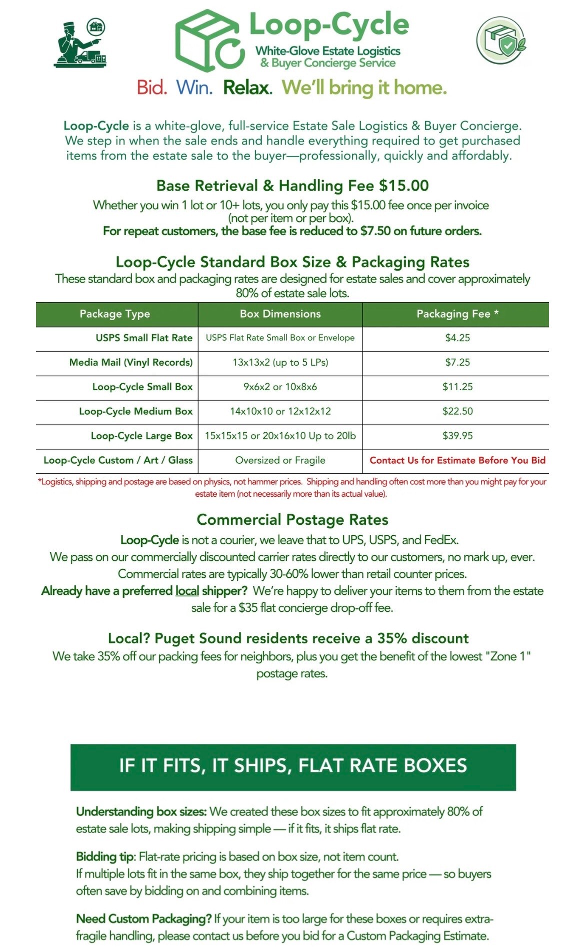 1. Flat Rate Box Pricing Posted Online *Flat-Rate Simplicity: Each box ships at a flat handling fee of $15 for first-time customers and is now $7.50 for repeat buyers. *USPS Small Flat Rate boxes will ship at Base Fee + discounted USPS postage (typically around $9.60). *If you win multiple lots, we’ll combine them whenever possible to save you money. *Bulky or Fragile Items: For larger or fragile pieces, just contact LoopCycle directly for a quick quote before you bid. Stress-Free Shipping: Once you’ve won, LoopCycle handles pickup, packing, and delivery coordination. It’s like having a personal concierge for your auction treasures!