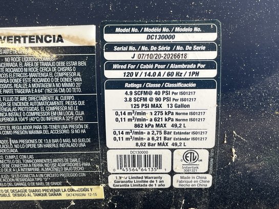 Campbell Hausfeld DC130000 Air Compressor. Tested and appears to work. Comes with everything shown. Sold as is.