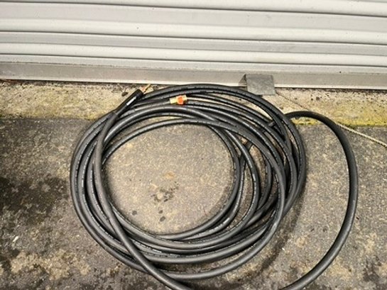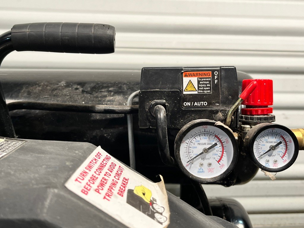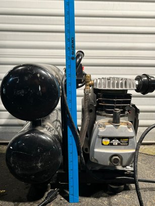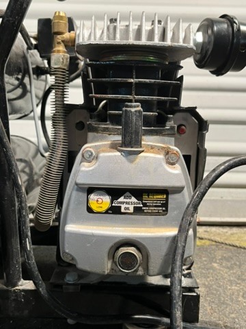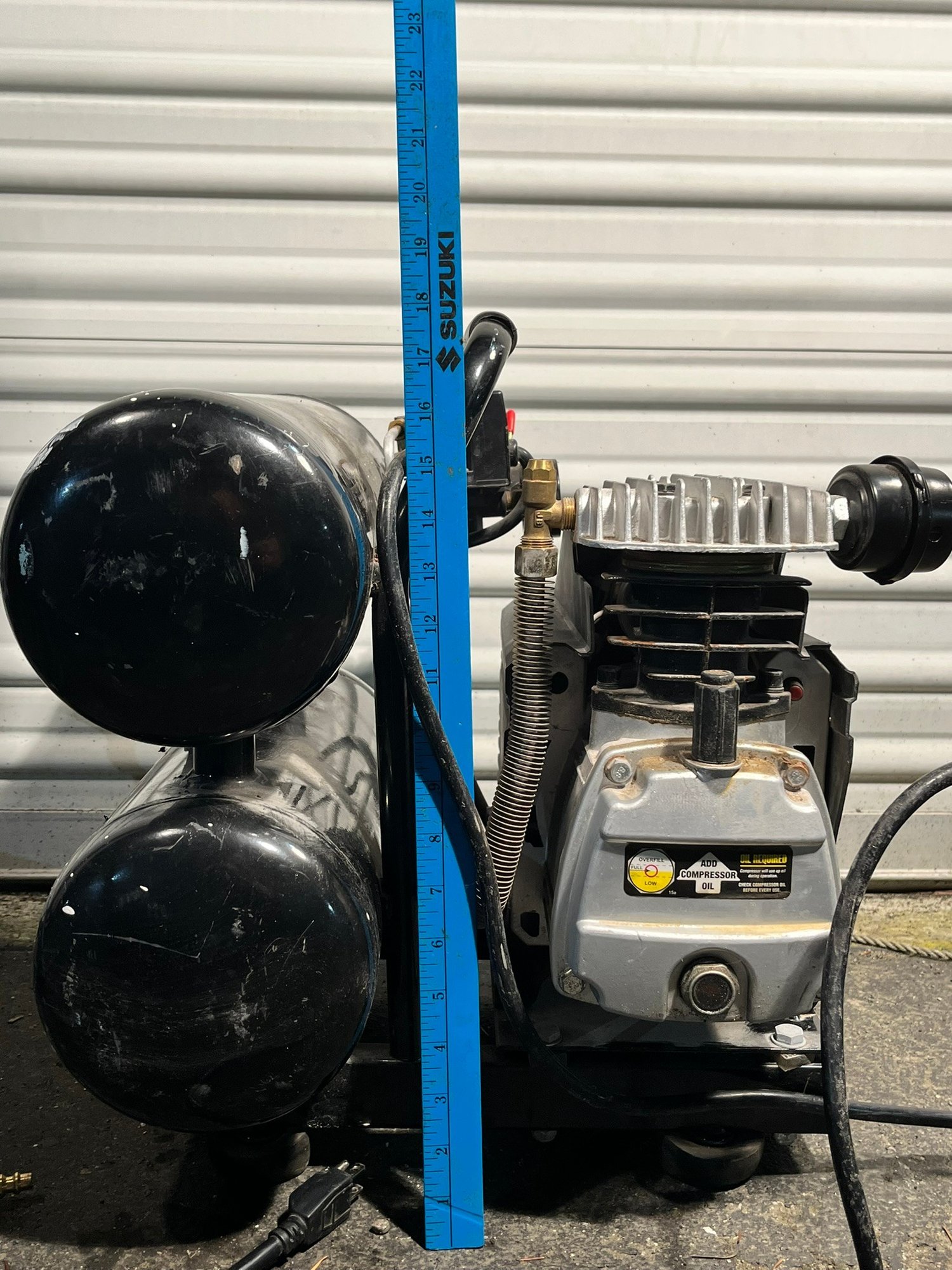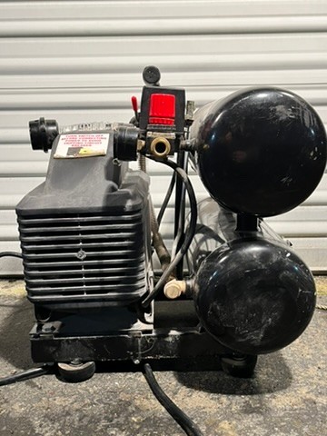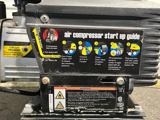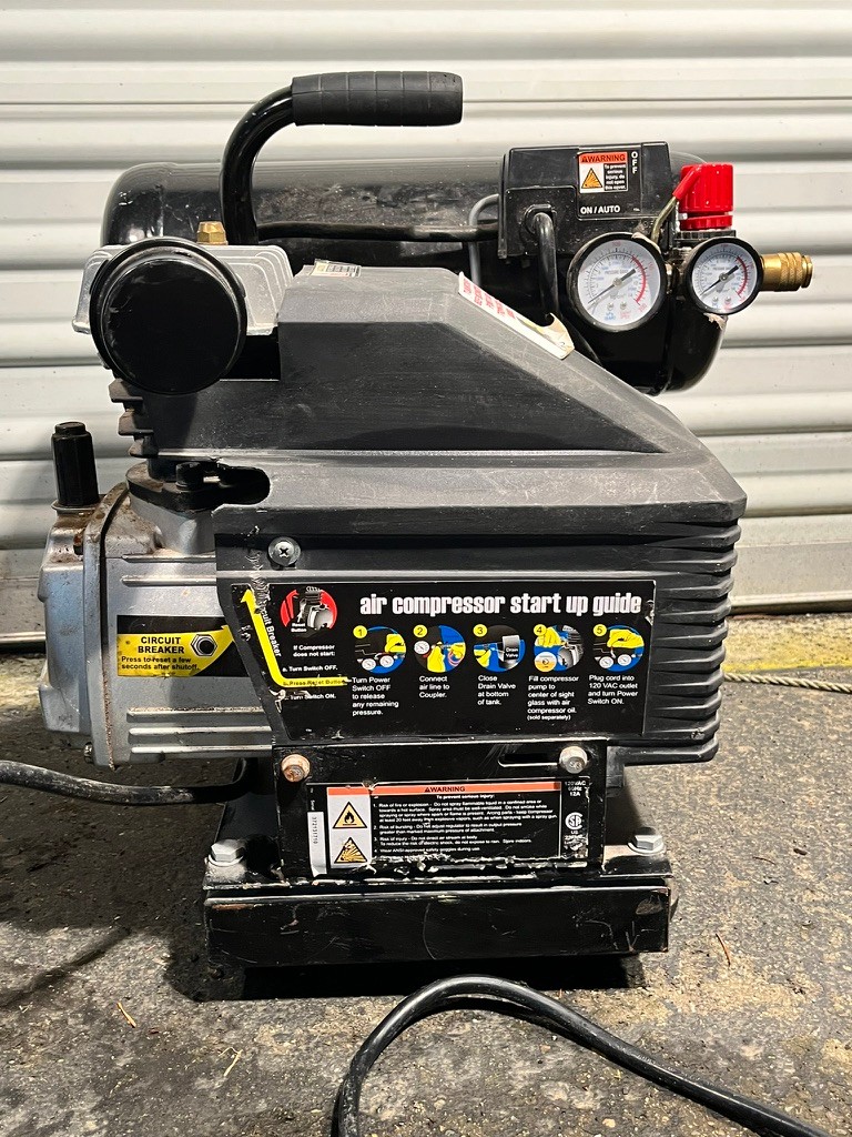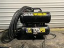 Central Pneumatic 125PSI Electric Air Compressor. Tested and appears to work. Includes an air hose that's estimated to be 50' long. Sold as is.