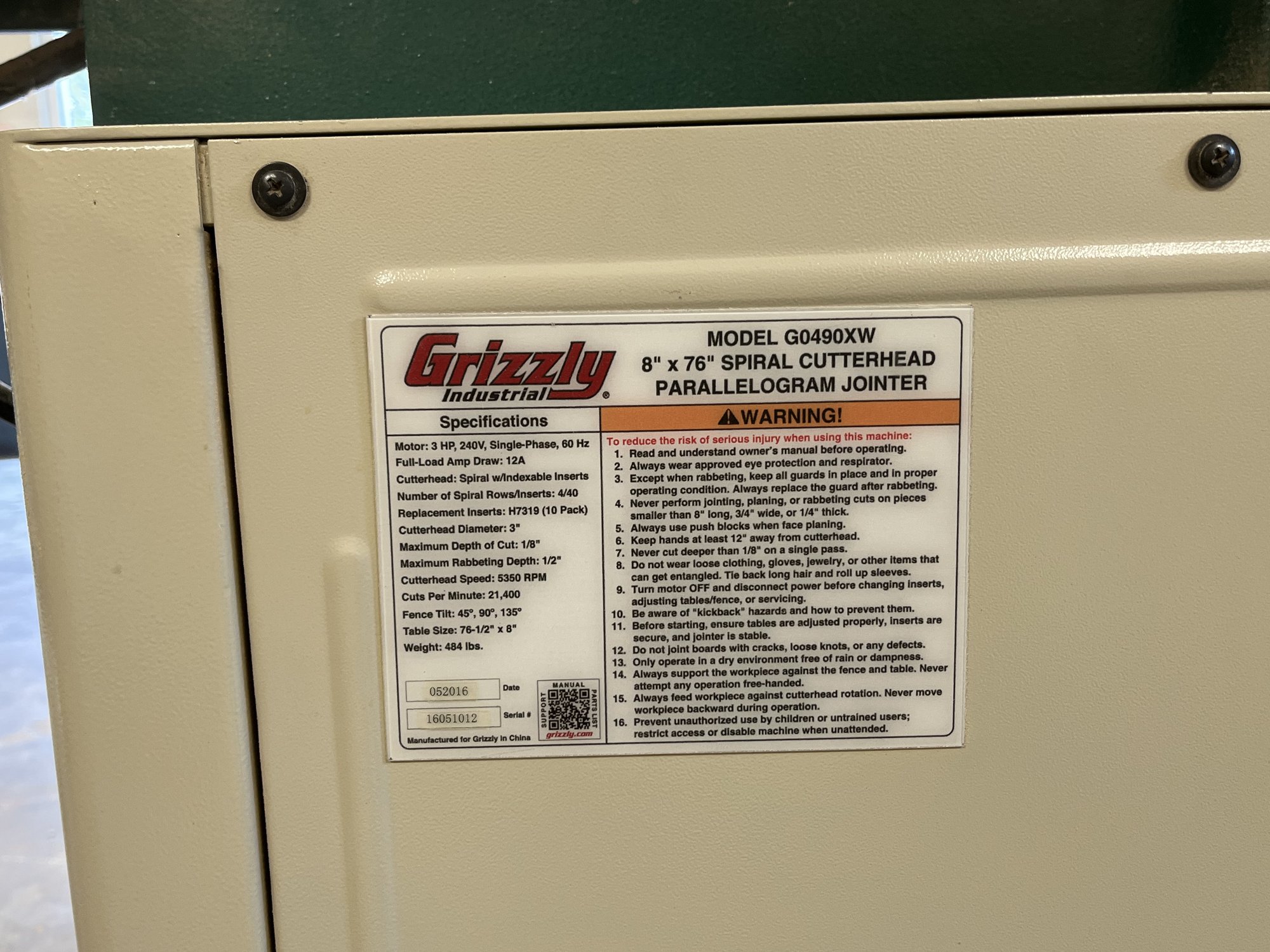 Grizzly G0490XW 8"x76" Spiral Cutterhead Parallelogram Jointer. Tested and appears to work. Sold as is.