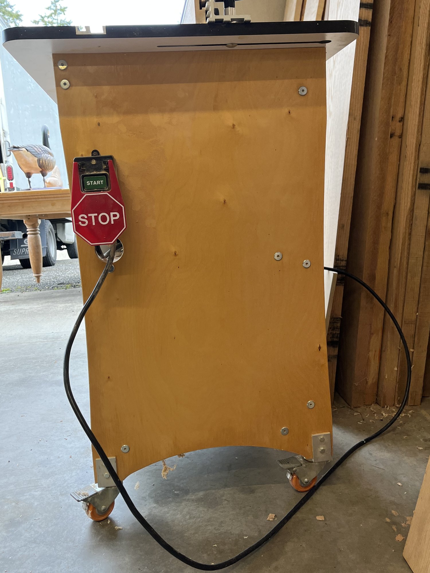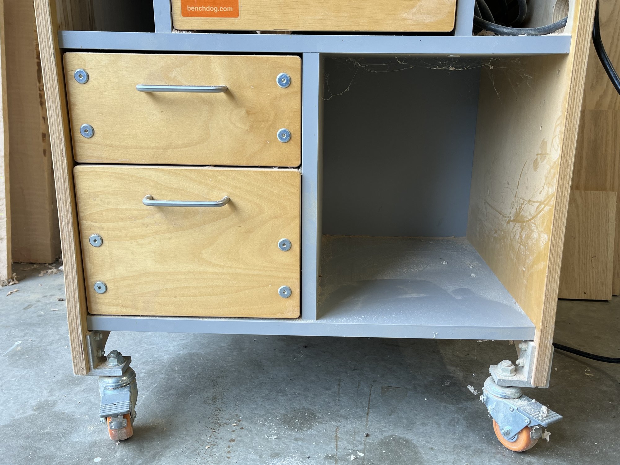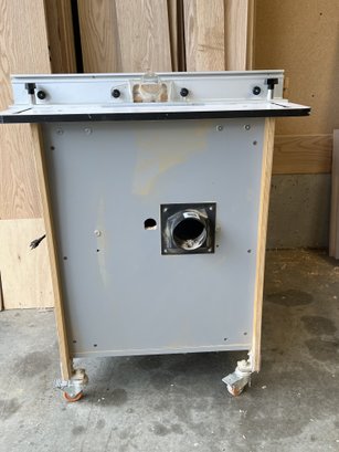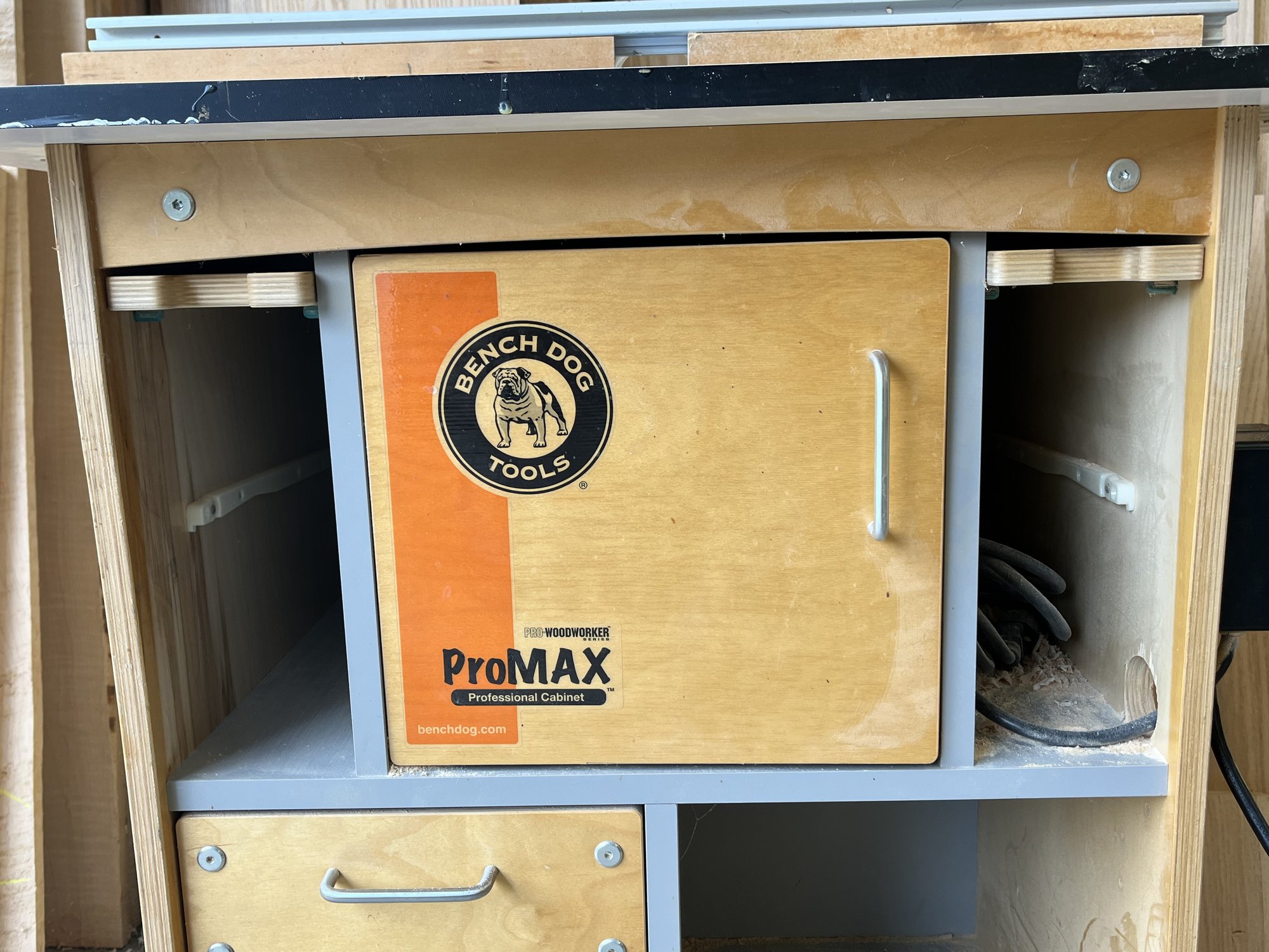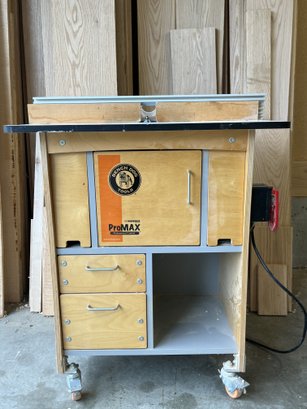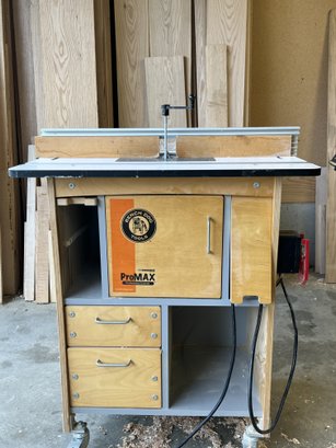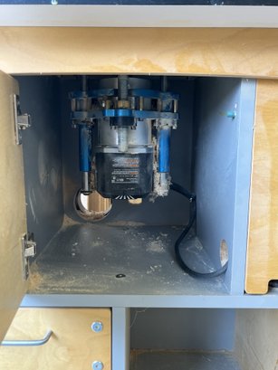 Rockler Model 7518 Router in a Bench Dog ProMax Router Cabinet. Tested and appears to work. Comes with everything shown. Sold as is.