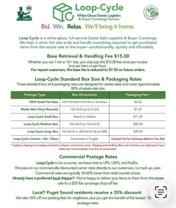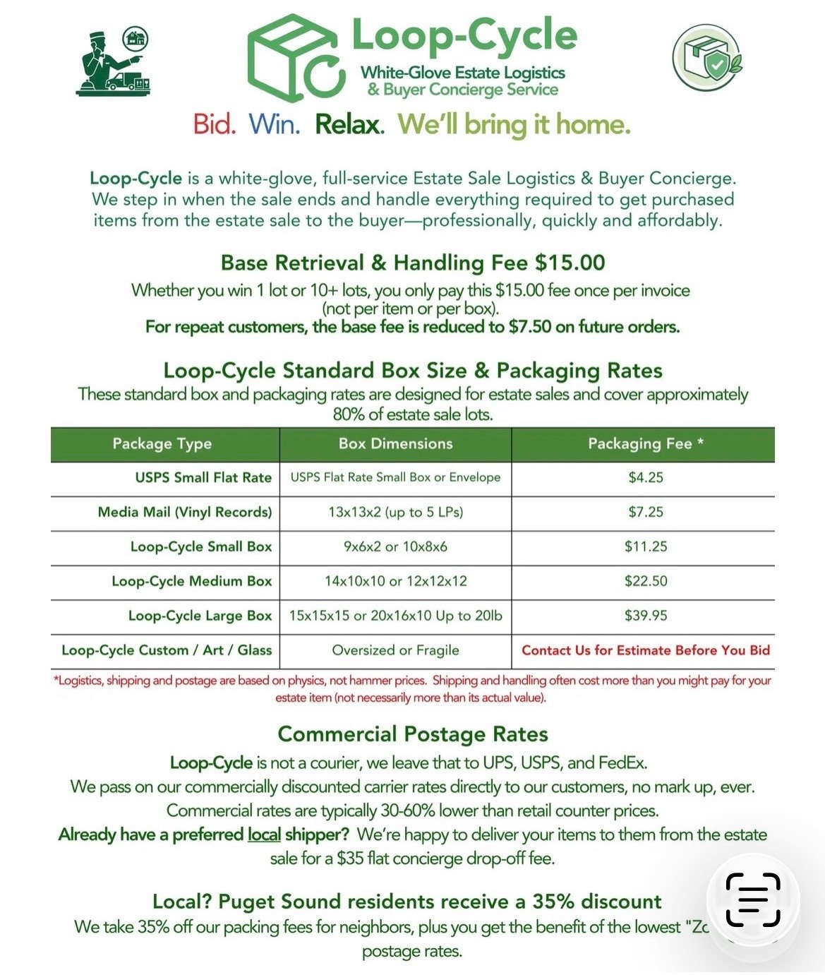 Please note the following important information regarding shipping and identification requirements for all winning bidders. **Identification and Shipping Address:** * All winning bidders are required to provide identification. The shipping address must match the address on your credit card and ID. If these do not match, we will be unable to release your items for shipping. Please ensure your shipping information is updated before placing any bids. No In-house shipping effective February 20th, 2026. We have outsourced to Loop-cycle.com LoopCycle handles all of our auction shipping! Here’s what you need to know: 1. Flat Rate Box Pricing Posted Online *Flat-Rate Simplicity: Each box ships at a flat handling fee of $15 for first-time customers and is now $7.50 for repeat buyers. *USPS Small Flat Rate boxes will ship at Base Fee + discounted USPS postage (typically around $9.60). *If you win multiple lots, we’ll combine them whenever possible to save you money. *Bulky or Fragile Items: For larger or fragile pieces, just contact LoopCycle directly for a quick quote before you bid. Stress-Free Shipping: Once you’ve won, LoopCycle handles pickup, packing, and delivery coordination. It’s like having a personal concierge for your auction treasures! 2. Standard Box Pricing Posted Online. The website now lists a simplified set of standard Small, Medium, and Large box sizes with pricing, so buyers can easily estimate shipping costs before bidding — without needing to request a quote. 3. New Online Quick Estimate Request Form. We’ve added a simple form that allows buyers to request an estimate directly from the website while browsing, particularly for lots that fall outside standard box sizes or require extra-fragile packing. For rates, box sizes and service details visit www.Loop-cycle.com. We cannot release your order until we have received both the signed invoice and, if applicable, a copy of your ID.* **Bid Retractions:** Bids cannot be retracted, canceled, or rescinded due to shipping issues, including costs or prohibitions. Bidders are responsible for considering all shipping costs before placing a bid.* **Liability:** HE&A is not responsible for loss or damage of purchased items handled or shipped, nor for actions or omissions by third-party shippers (whether recommended by HE&A or not).* **International Regulations:** Buyers must be aware of local regulations regarding the shipping or receipt of items such as ivory, taxidermy, and firearms. HE&A will not alter packing slips, lot descriptions, or prices paid. If items are seized by customs, HE&A is not liable for costs or refunds. If you are unsure about local rules and regulations, please do not bid on items that may violate those regulations.