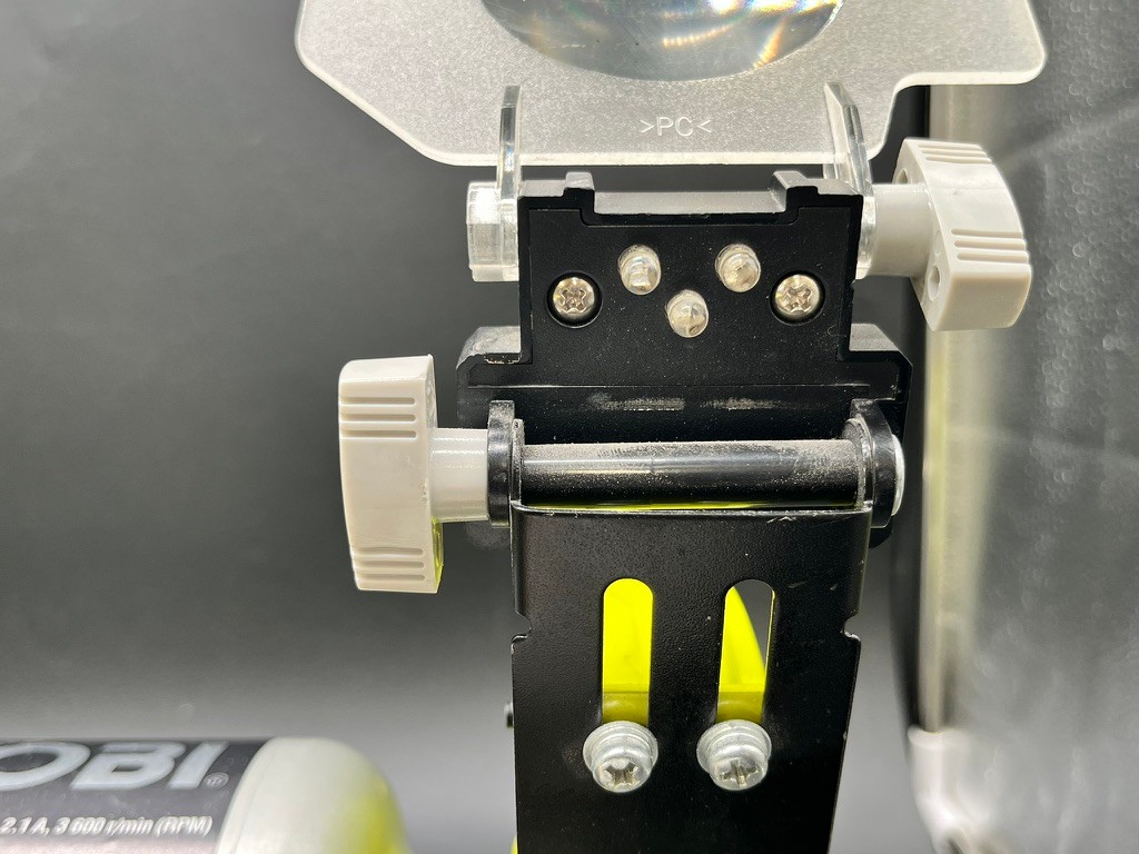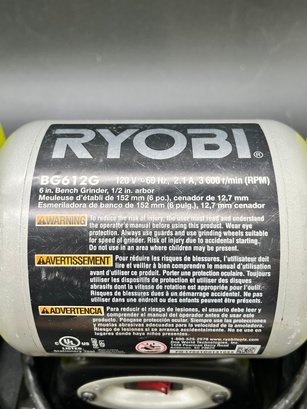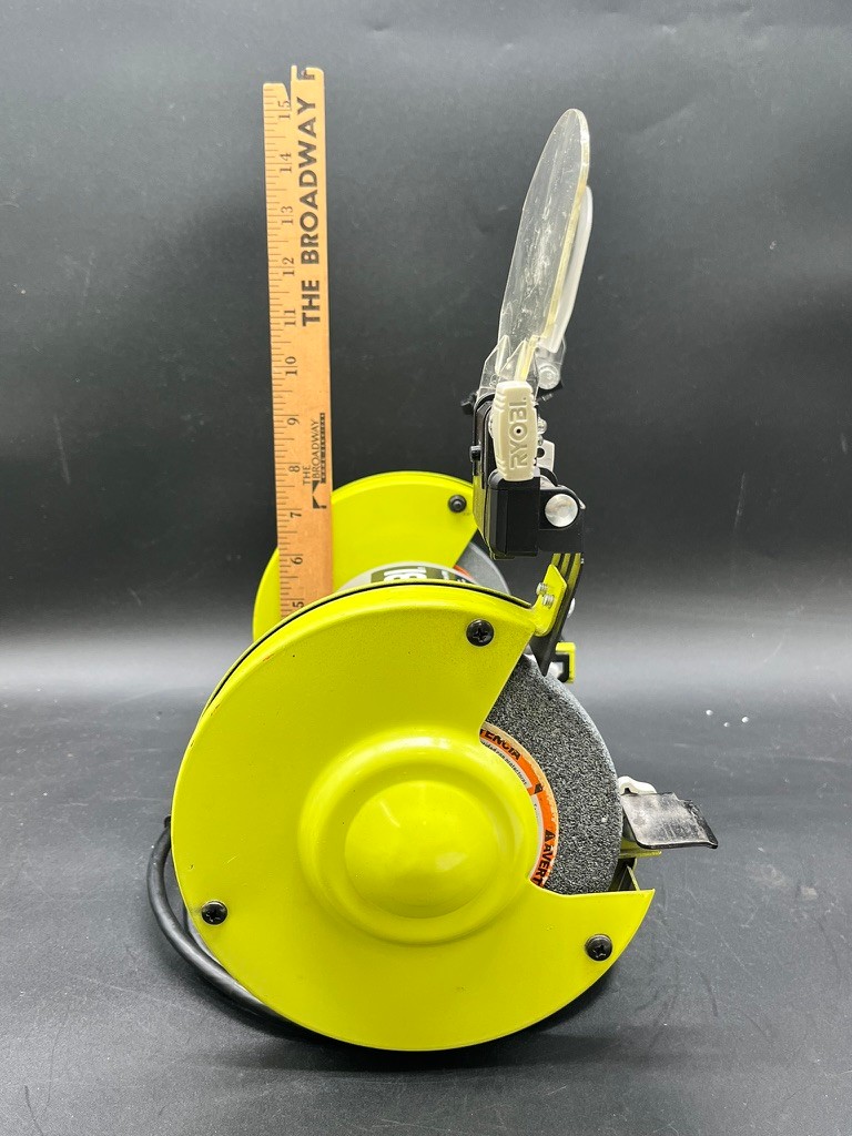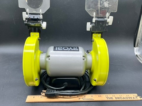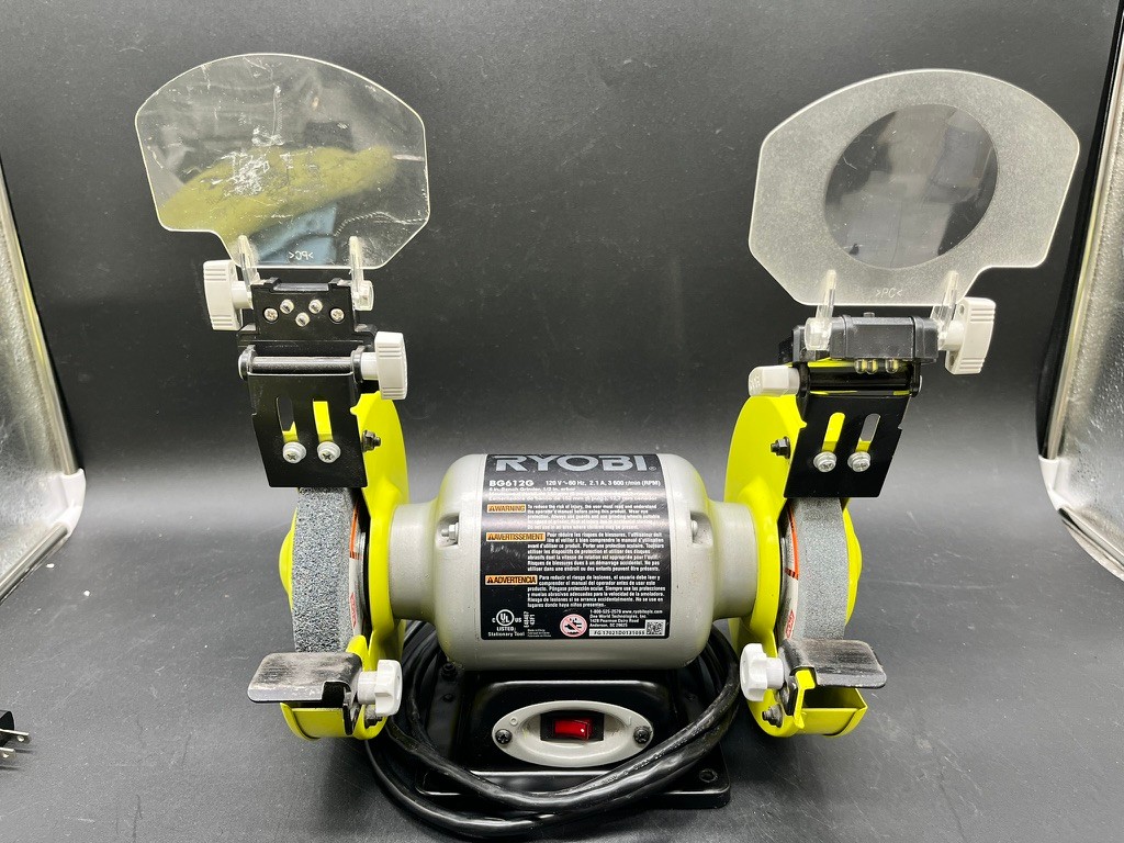 Ryobi BG612G Bench electric Bench Grinder. Both the grinder and the work lights have been tested and appear to work. One of the battery covers for the work lights is missing. Sold as is.