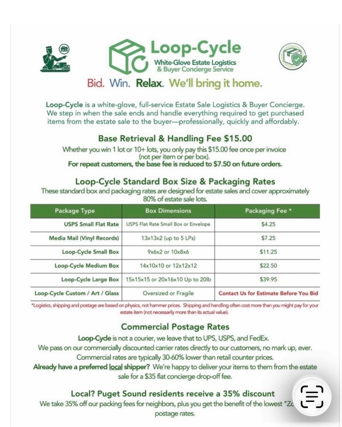 1. Flat Rate Box Pricing Posted Online *Flat-Rate Simplicity: Each box ships at a flat handling fee of $15 for first-time customers and is now $7.50 for repeat buyers. *USPS Small Flat Rate boxes will ship at Base Fee + discounted USPS postage (typically around $9.60). *If you win multiple lots, we’ll combine them whenever possible to save you money. *Bulky or Fragile Items: For larger or fragile pieces, just contact LoopCycle directly for a quick quote before you bid. Stress-Free Shipping: Once you’ve won, LoopCycle handles pickup, packing, and delivery coordination. It’s like having a personal concierge for your auction treasures!
