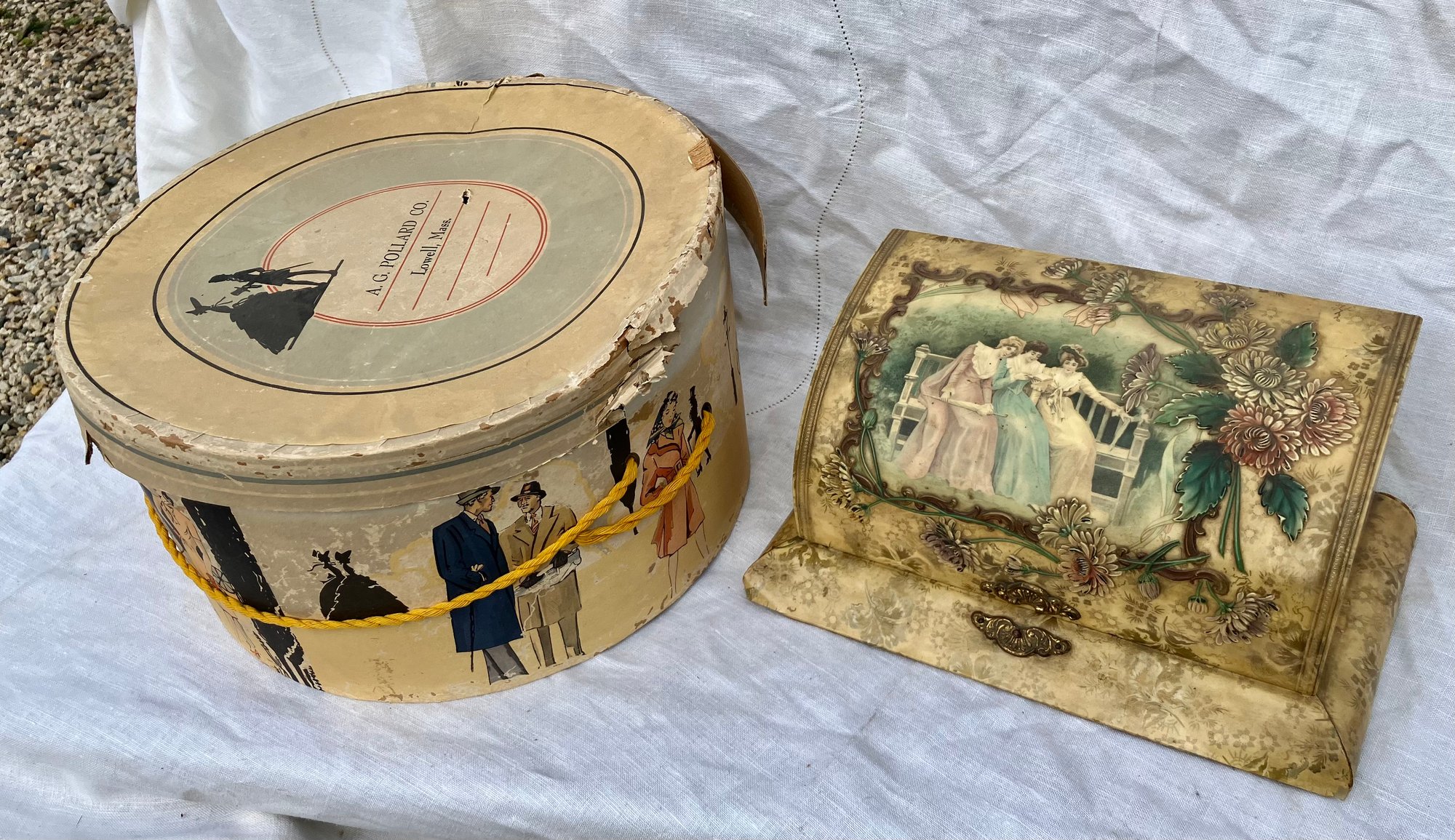 Ladies Hat Box And Celluloid Cuff Box With Decorated Lid