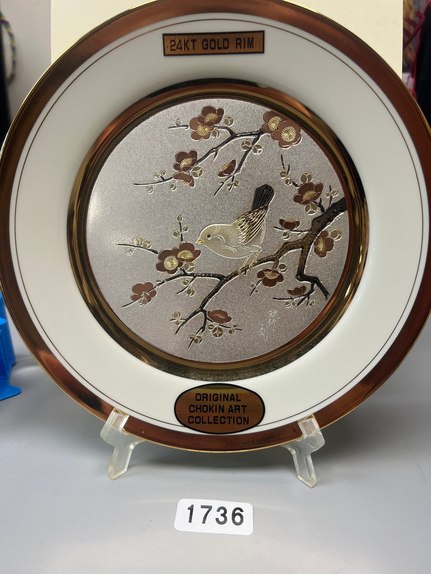 - **Design**: The center features a beautifully engraved image of a bird perched on a branch with blossoms, typical of Chokin art, which often highlights nature and wildlife.