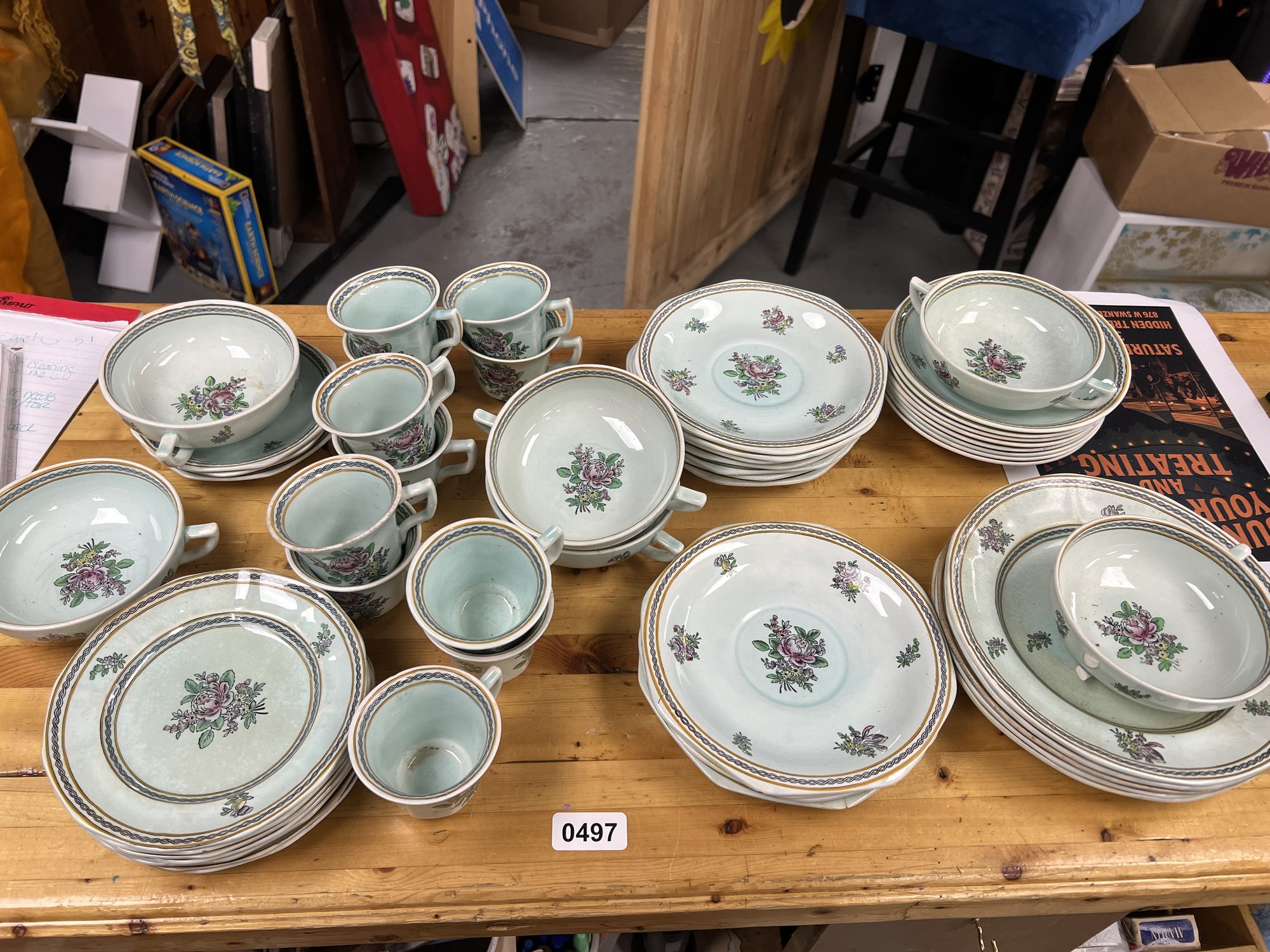 Embrace the beauty of vintage elegance with this 51 piece Calyx Ware England set. Despite some chips and broken handles, this set exudes charm and sophistication. Perfect for adding a touch of character to your dining collection.