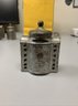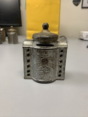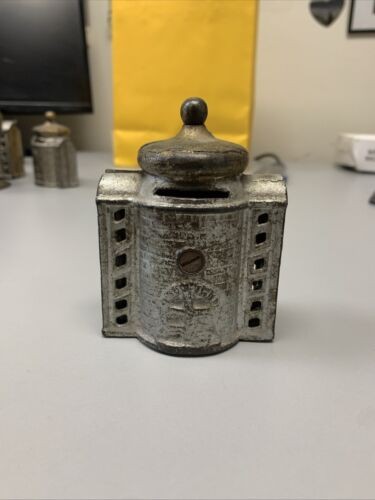 This is being sold as is. It is not perfect due to age which the top part near the dome has a slightly curved piece which may have been a manufacturing issue. It has the original gold colored paint and some patina due to age. This is the smaller bank. The coin hole is not perfectly rectangle either as shown in photos. Please see photos for condition.