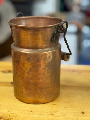 Rustic handled copper pot — warm patina and farmhouse charm.