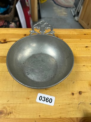 A beautifully crafted pewter dish featuring a sturdy handle and traditional European design. Perfect for display or serving with vintage elegance.