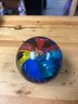 - The paperweight is spherical in shape, showcasing a dynamic swirl of colors including blue, green, yellow, orange, and red.