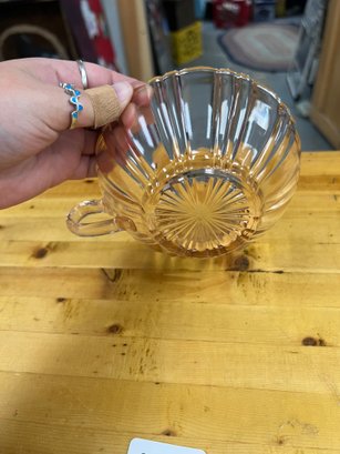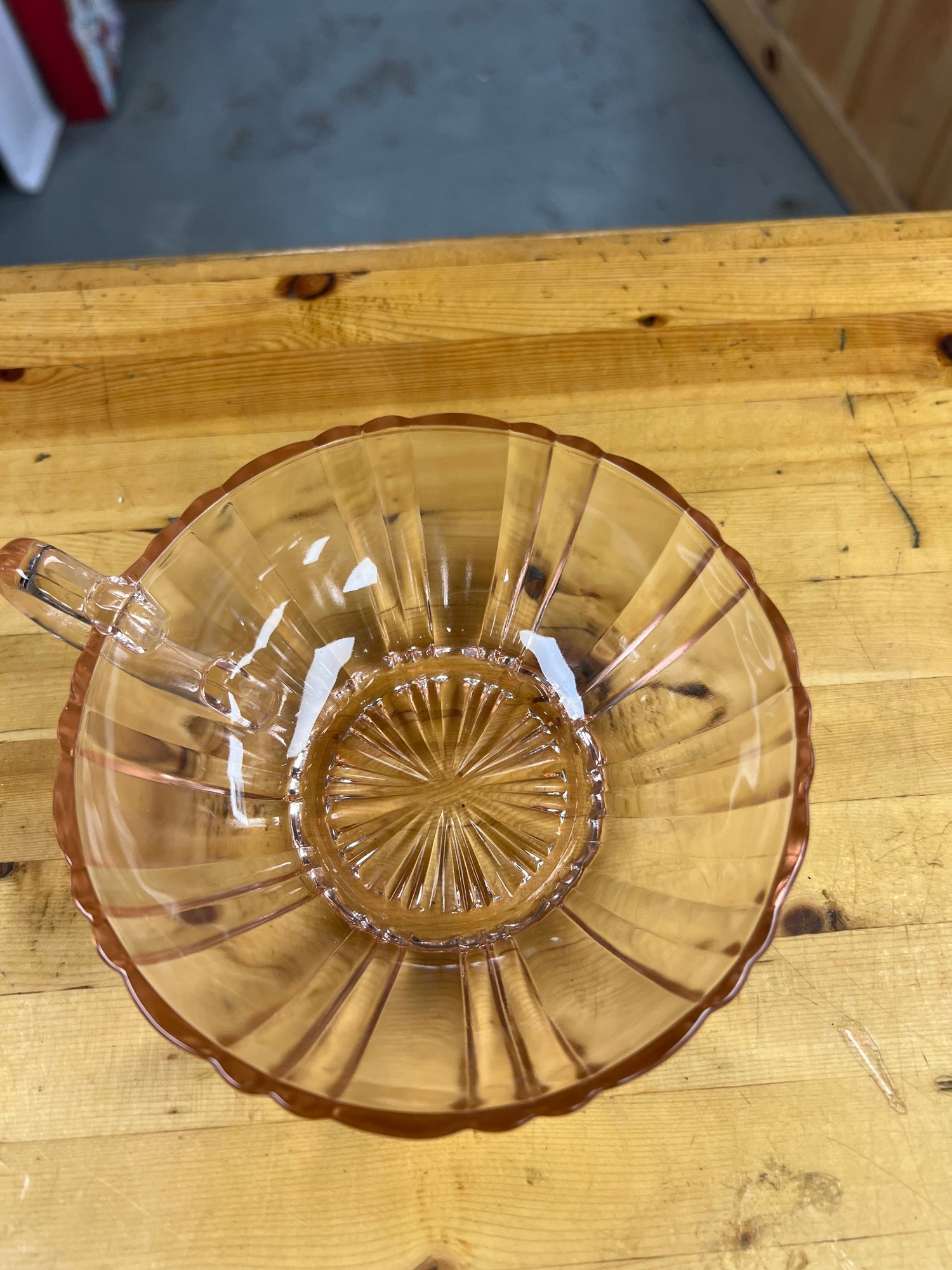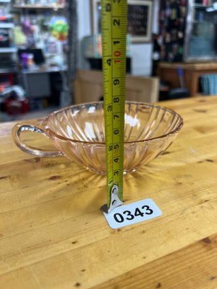 This vintage pink Depression glass handled cup showcases the refined craftsmanship and delicate beauty of early 20th-century glassware. Its detailed pattern and luminous pink color make it a favorite among collectors. Ideal for completing a set, displaying with matching saucers, or adding a romantic vintage touch to any collection.