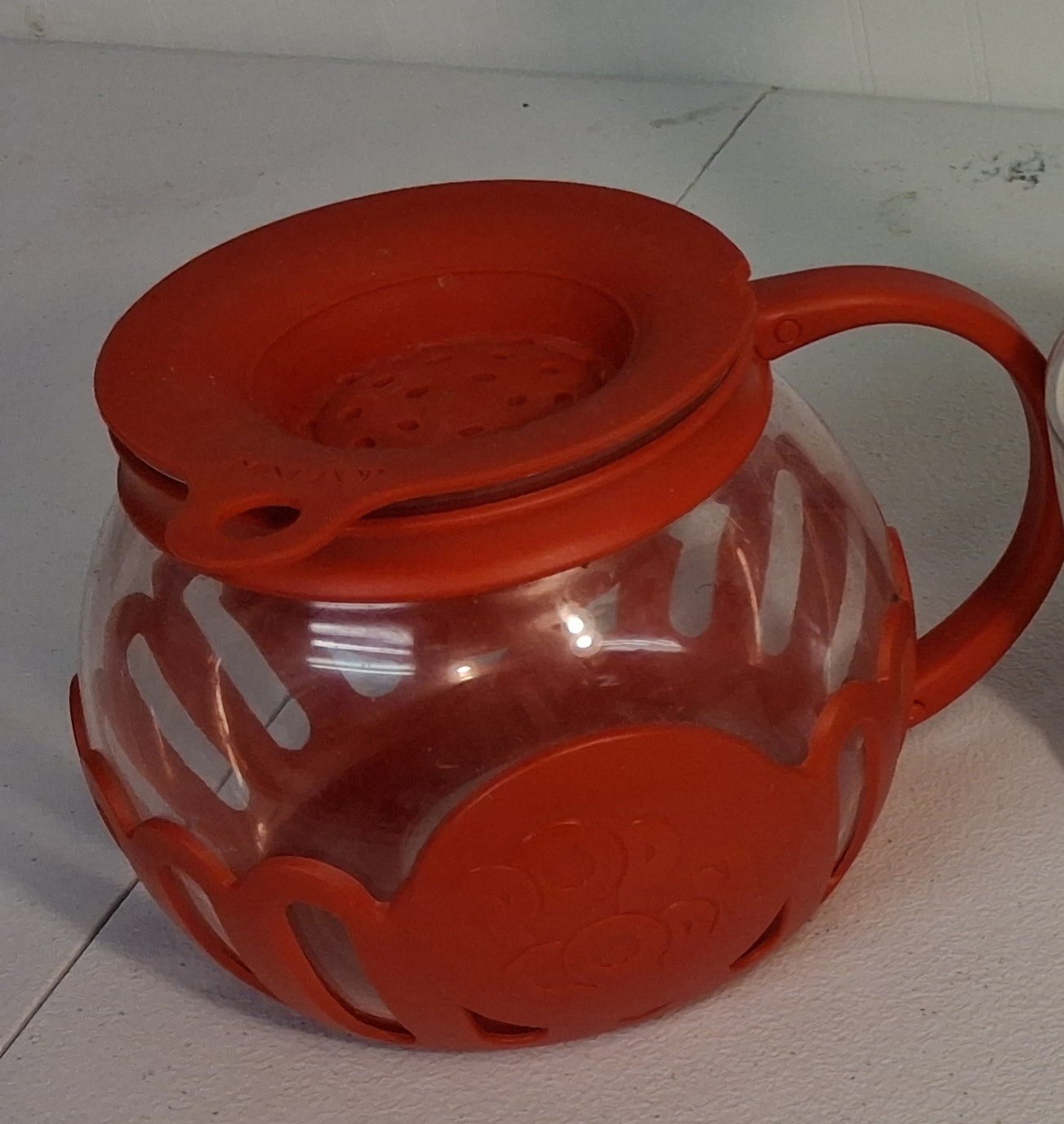 This glass coffee carafe with red plastic frame features a built-in strainer lid and sturdy handle, making it perfect for serving coffee, tea, or infused drinks. The vibrant design adds a fun vintage touch to any kitchen or table setting.