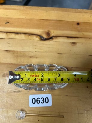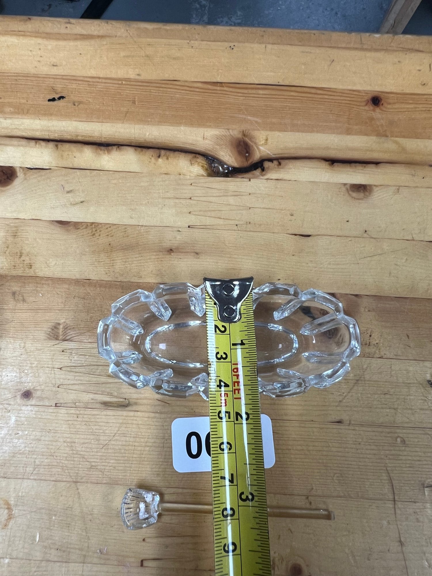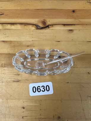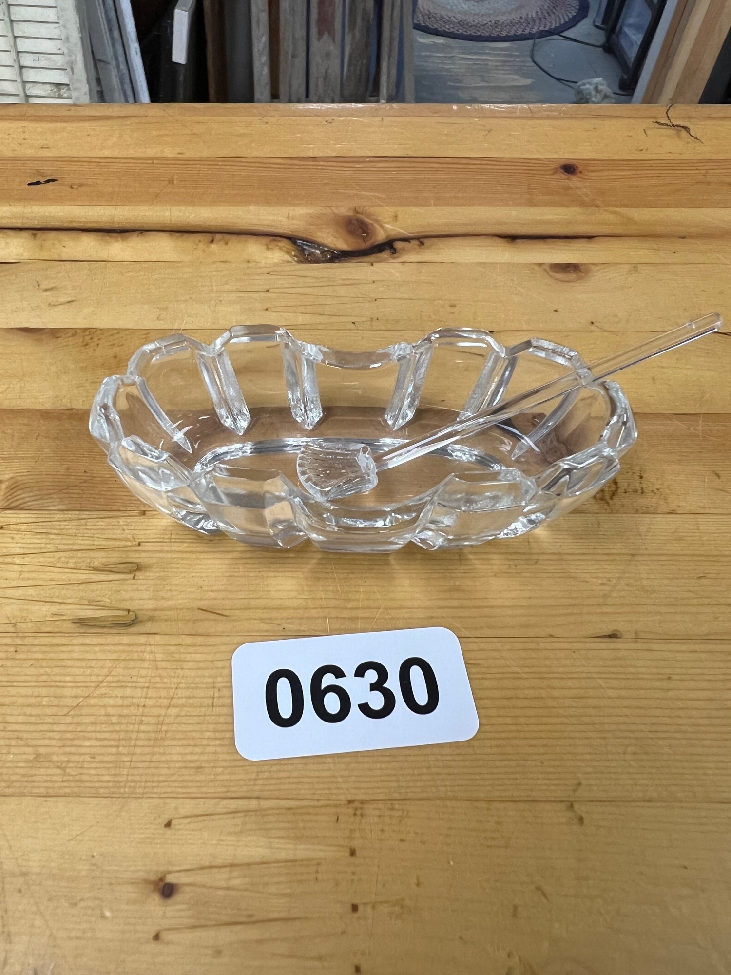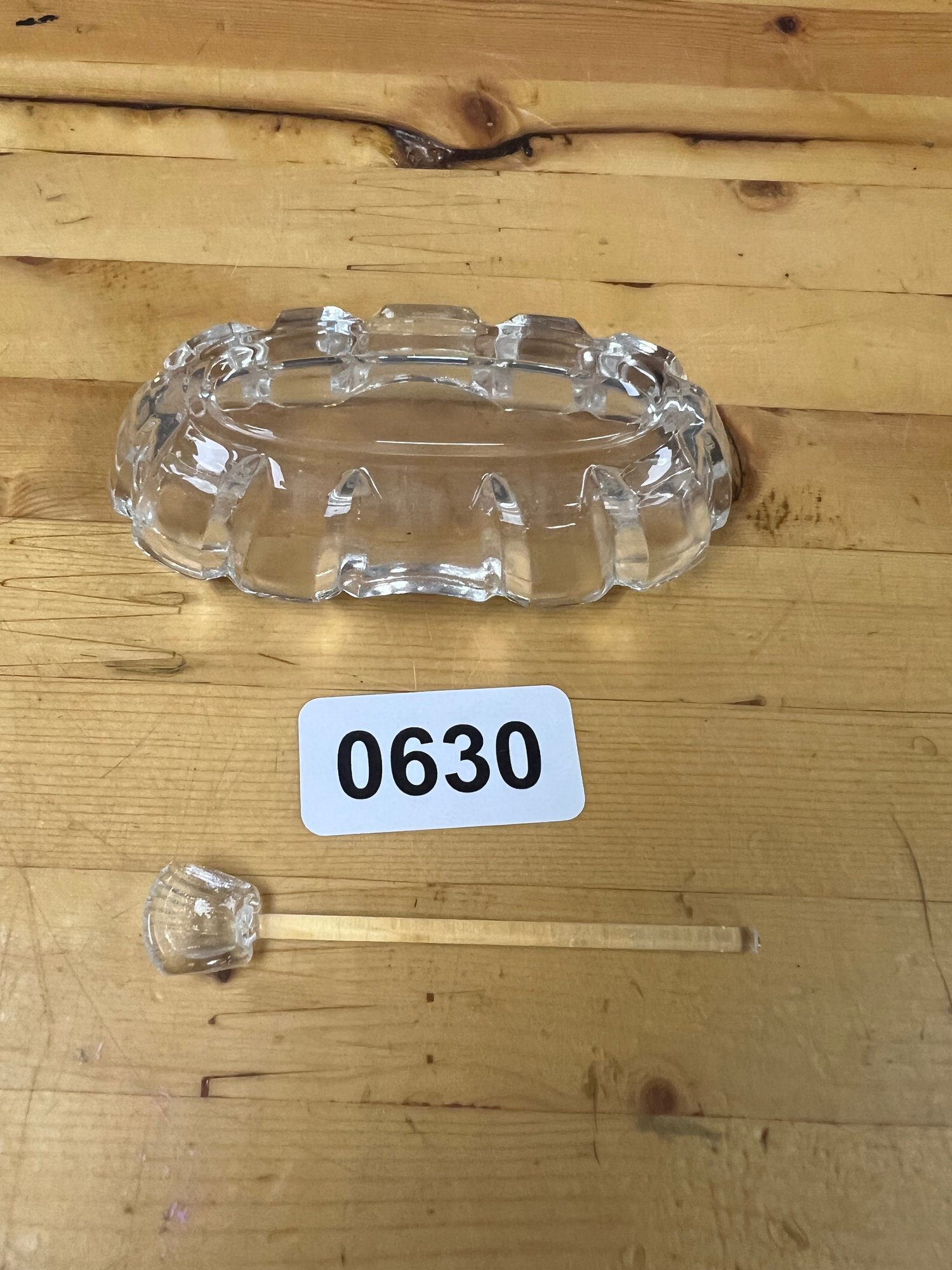 Charming oval glass salt cellar complete with small spoon — functional collectible.