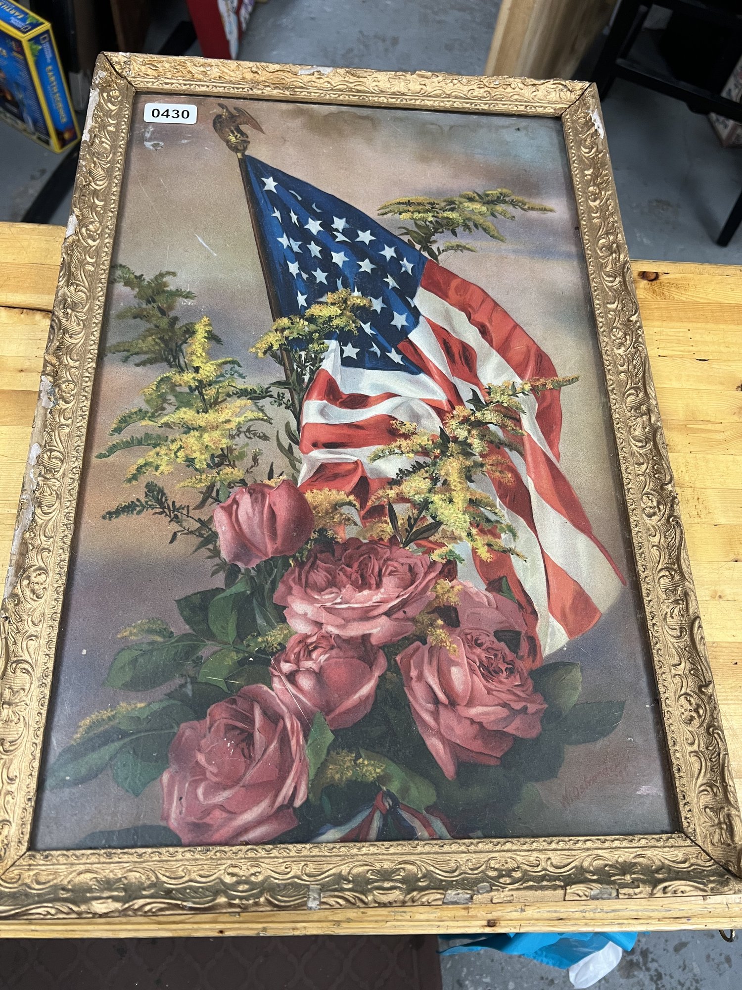 Show your patriotism with this beautiful print of the American flag adorned with roses. A striking piece for any Americana collection. As is, as seen in photographs.