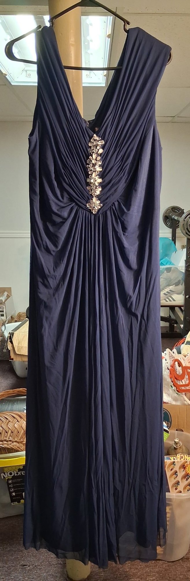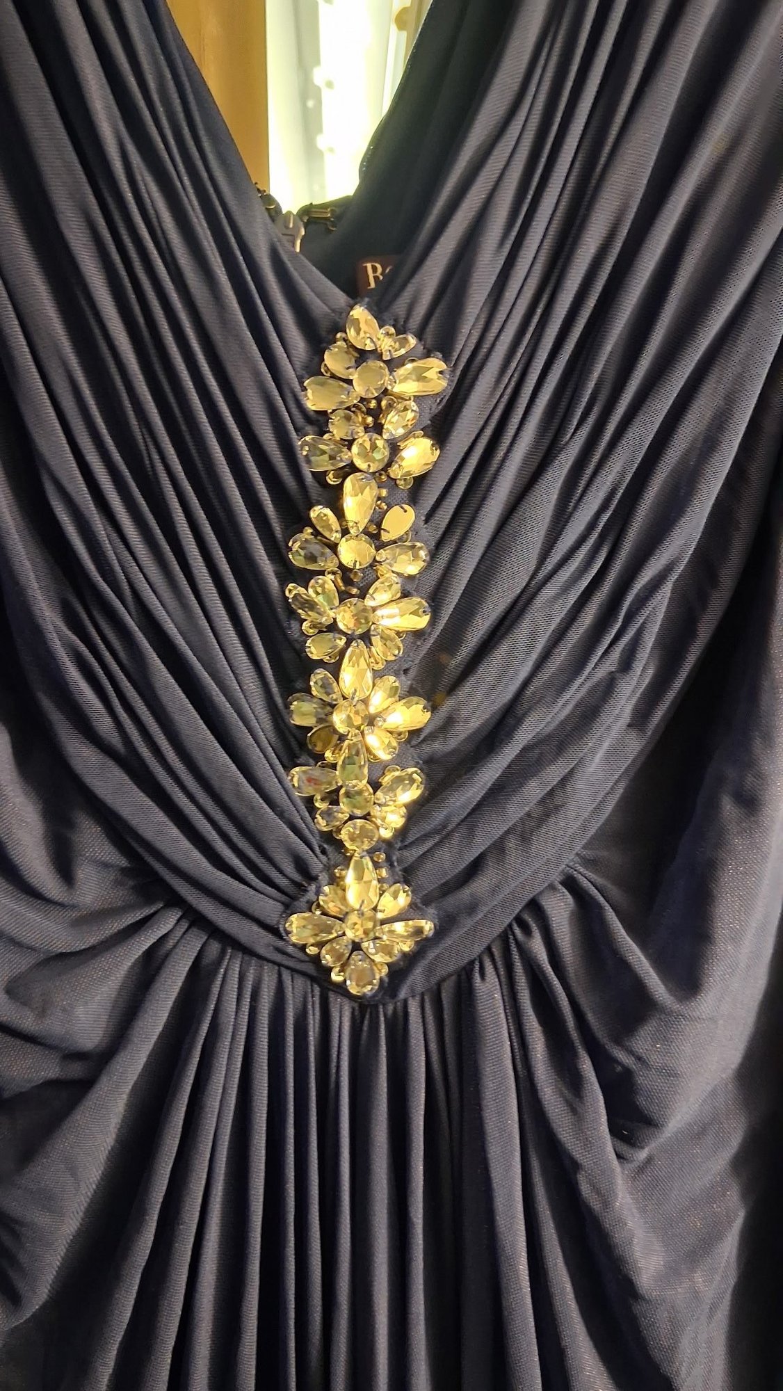 Classic elegance with a touch of shimmer ✨ This beautiful navy blue formal dress from Roaman’s features a flattering draped bodice with a deep V neckline and a stunning beaded accent at the center that catches the light just right.