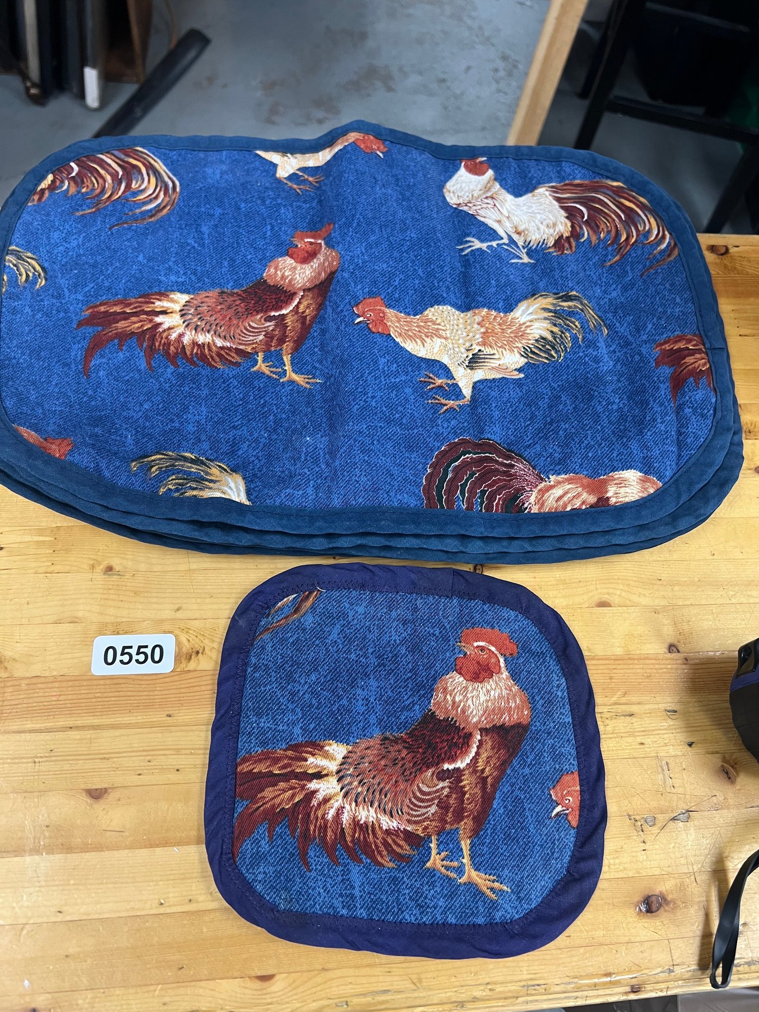Country-kitchen inspired set featuring roosters and hens — includes placemats and matching pot holders.