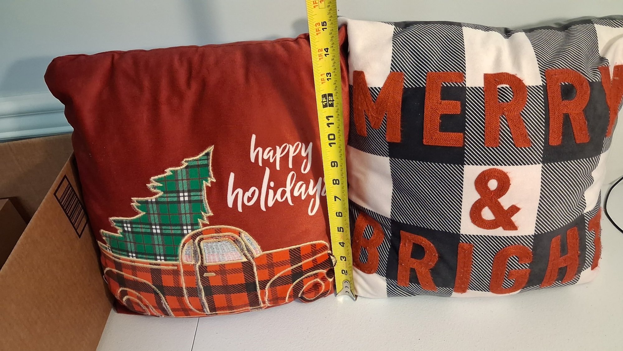 This set of 2 holiday throw pillows features classic seasonal designs, including a “Happy Holidays” plaid truck and a bold “Merry & Bright” pattern. Perfect for adding warmth and charm to your couch, chair, or holiday décor setup.