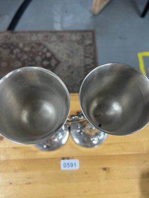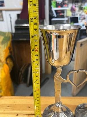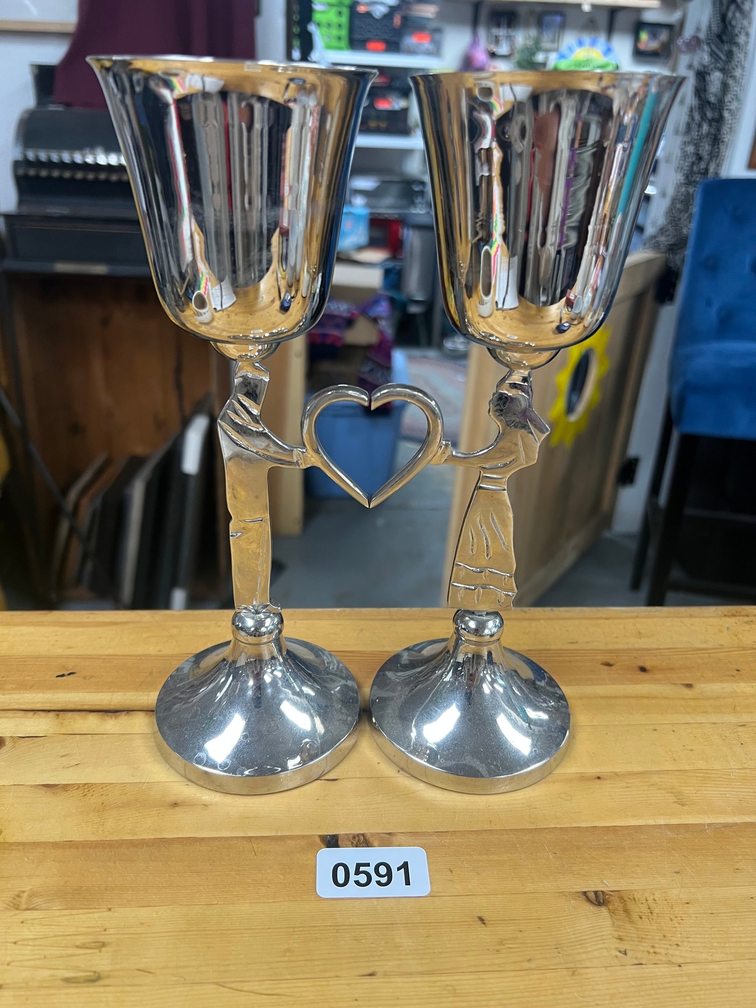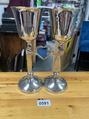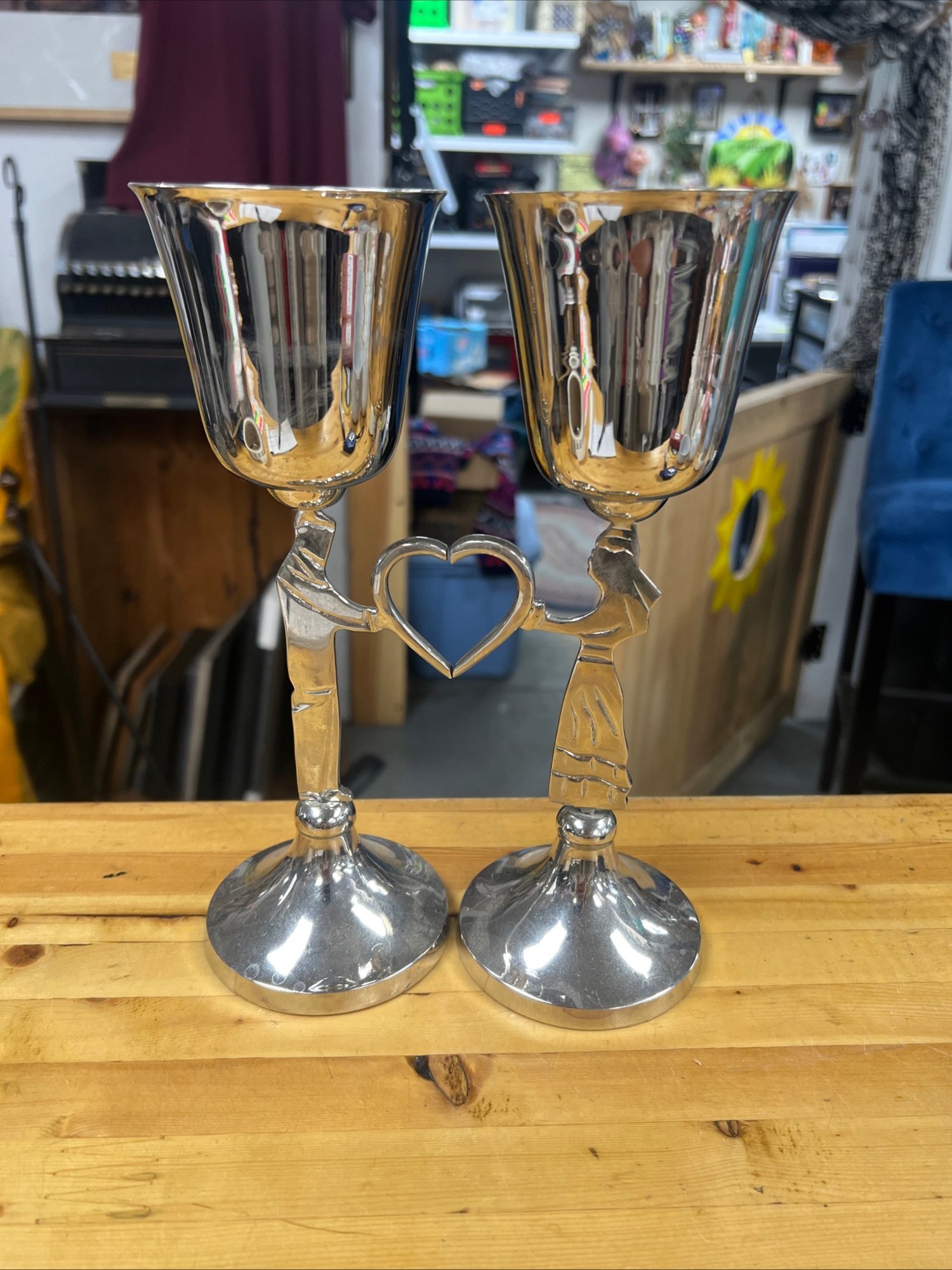 Charming metal wedding cups featuring bride and groom designs — unique display pair.