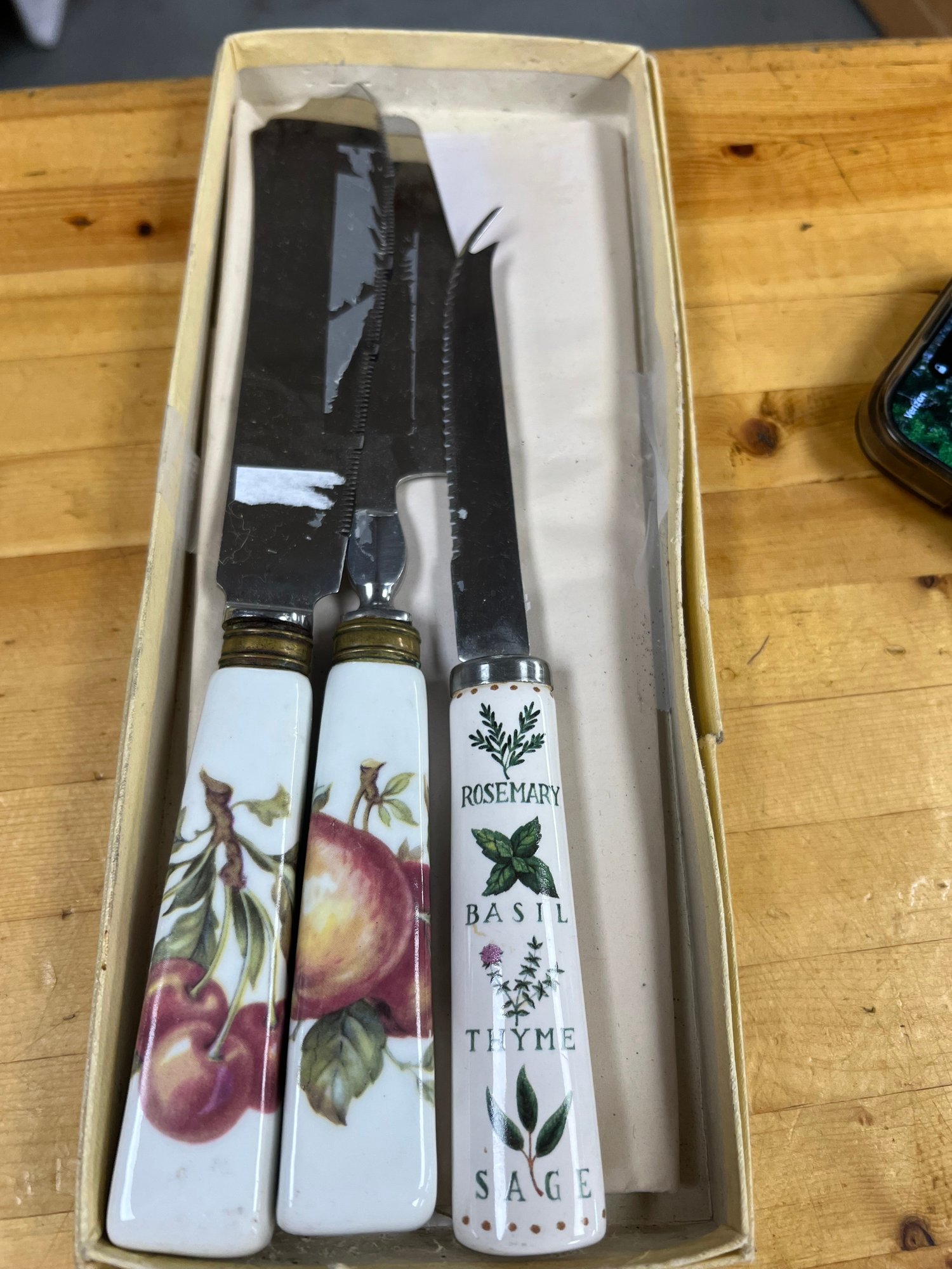 Set of 3 Porcelain-Handled Kitchen Knives – A stylish trio featuring decorative porcelain handles. Perfect for everyday kitchen use or as a charming vintage display set.