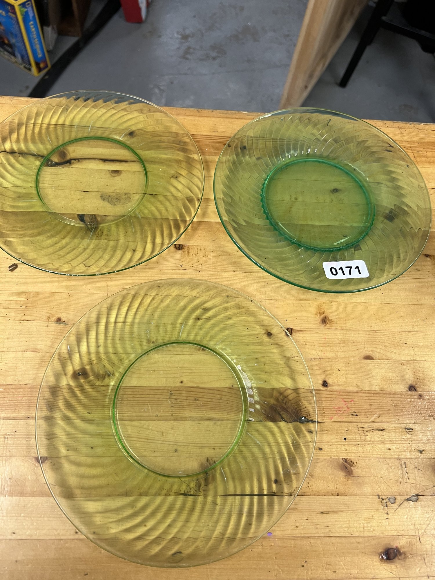 Serve up style with this set of 3 uranium swirl plates. The unique swirl pattern and vibrant color make these plates a must-have for any dinner party or special occasion.