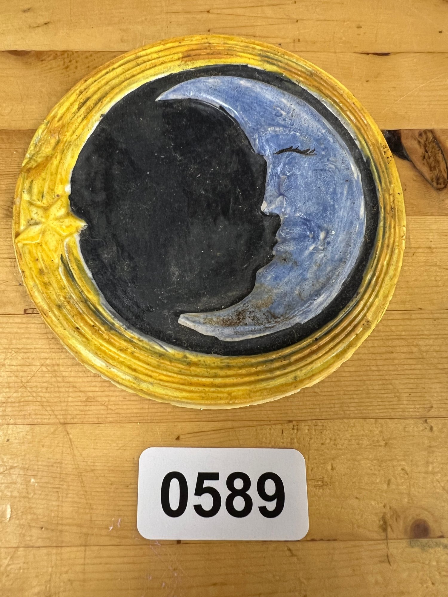 Whimsical circular moon décor with hand-painted detail — perfect celestial accent.