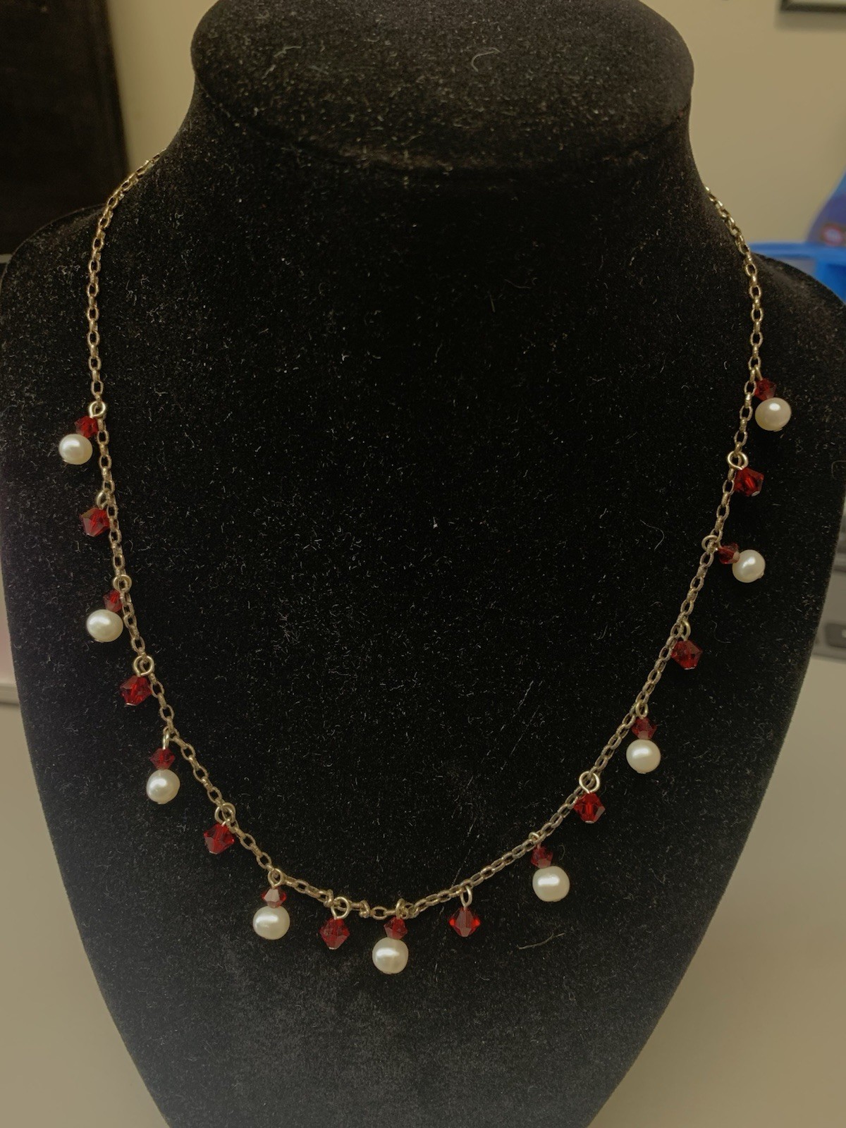 Unsure if the red parts are glass or plastic. Please see photos for condition. It needs a good cleaning to it as the Sterling has oxidized as shown in photos. Unsure if the pearls are real or not. This is a wonderful necklace and is being sold as is and as marked.
